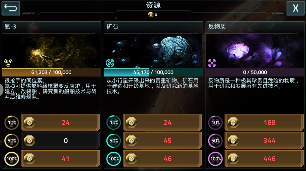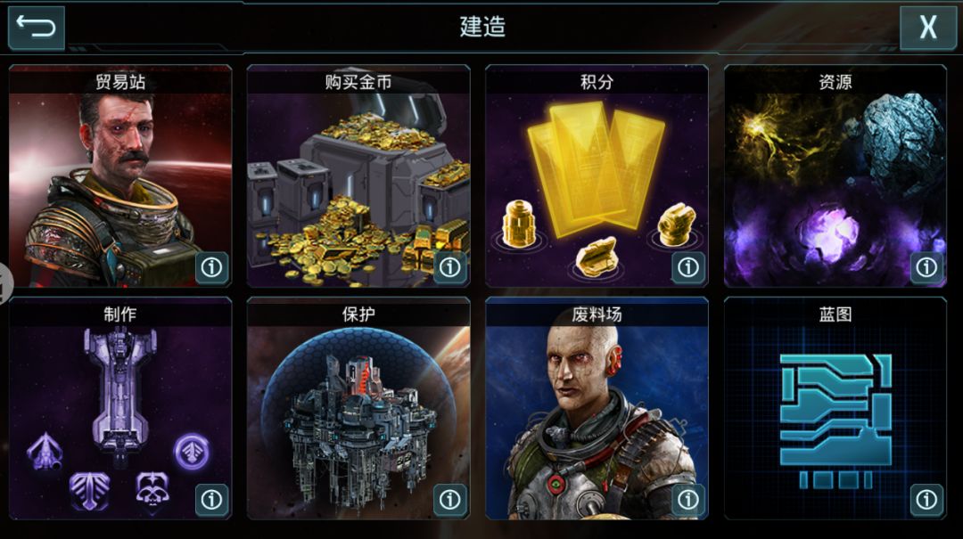 在全新的模块中,官方基本将所有的交易模块全部整合在了一起,更加方便指挥官找到它。其中,贸易站、积分、制作、废料场是各种道具、图纸、科技的出产地,而资源、蓝图、保护罩以及购买金币则是将游戏中的众多功能集中整合的体现。