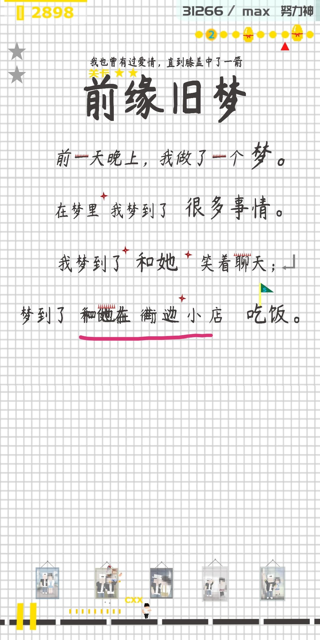 前缘旧梦貌似有BUG?有时候会这样,然后不管怎么按屏幕都跳不了(另外问一下“不怕机关暗器”到底不怕哪些?我碰到那个红色的十字飞镖还是会“死”
