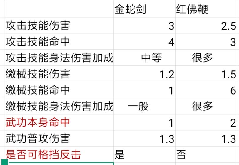 从图上可以看出红佛鞭无论是伤害,还是命中,都优于金蛇剑,这让金蛇剑这个氪金武功处于一个尴尬的地位。