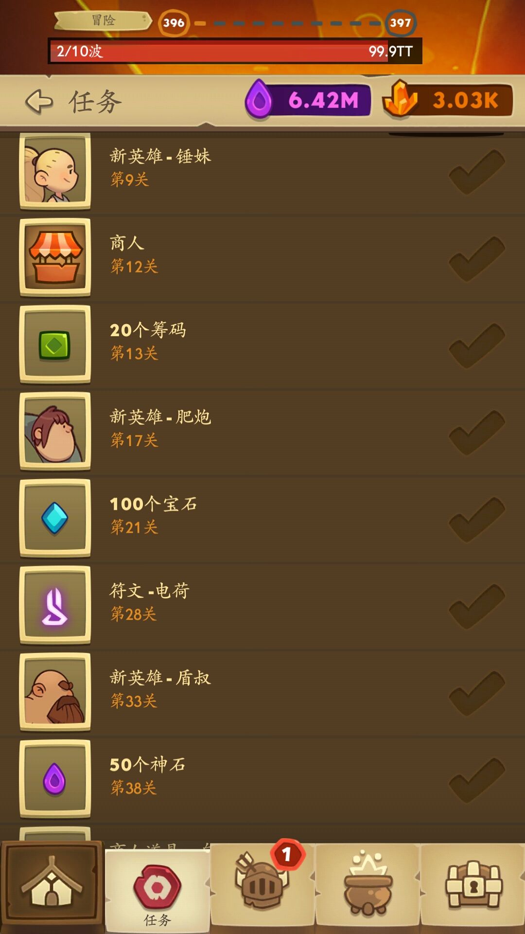 这游戏玩了蛮久了,我来分享一下前期应该干嘛吧,后期肝图是照大佬的炸弹人流派,不过大家也看到了那位大佬的神器属性图了,他是已经全满属性了。而我要说的是,前期推图最好是,胖锤,锤妹,贼妞,肥炮,断剑,就照这个阵容这么打,刷神石开神器,常规神器坑有35个,宝石千万不能乱用,都拿来开神器坑,有坑就造神器,不然就刷低QP的神器,在神器没有10QP之前的品质不代表什么。如果可以,就尽量往后打,先把人物集齐,如果有弓娘之后刷神石阵容可以改为,胖锤,锤妹,贼妞,弓娘,肥炮。附上各个人物解锁的关卡。