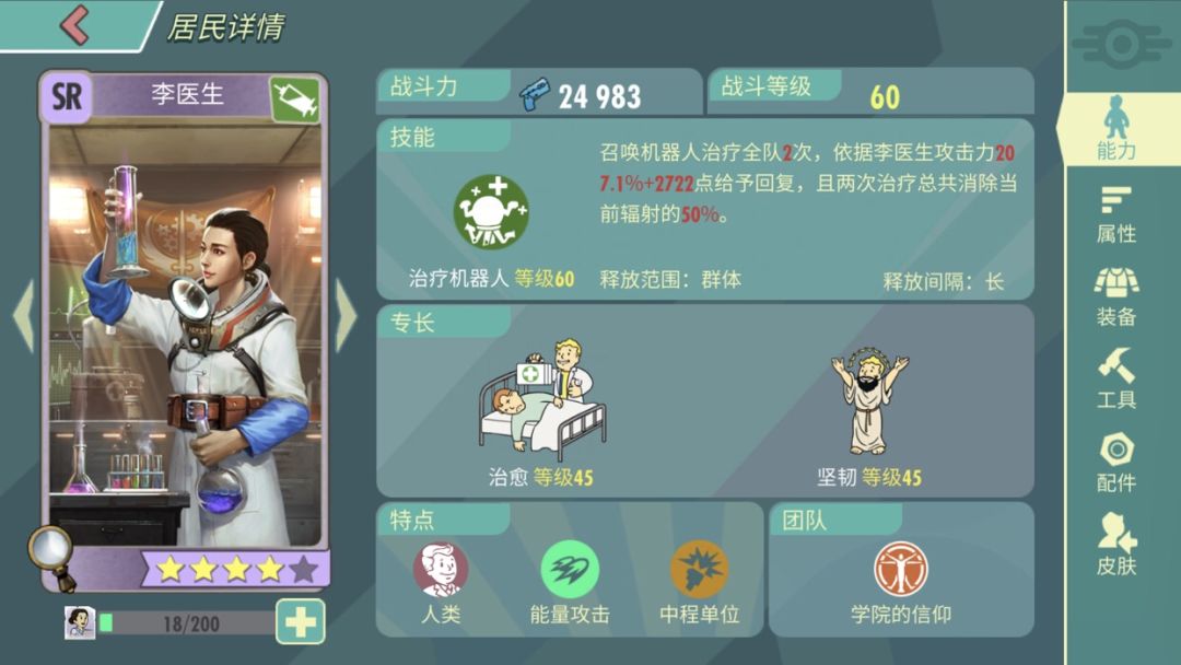 第三位:李医生,对应治疗,可以一直用到满级,PVE都很不错,PVP稍微差一点,该英雄适合学院套,该英雄是群疗奶妈,治疗量惊人,且能恢复辐射,刷本效果很好,入手难度不大,可以在学院大本营兑换,并且活动也能获取。