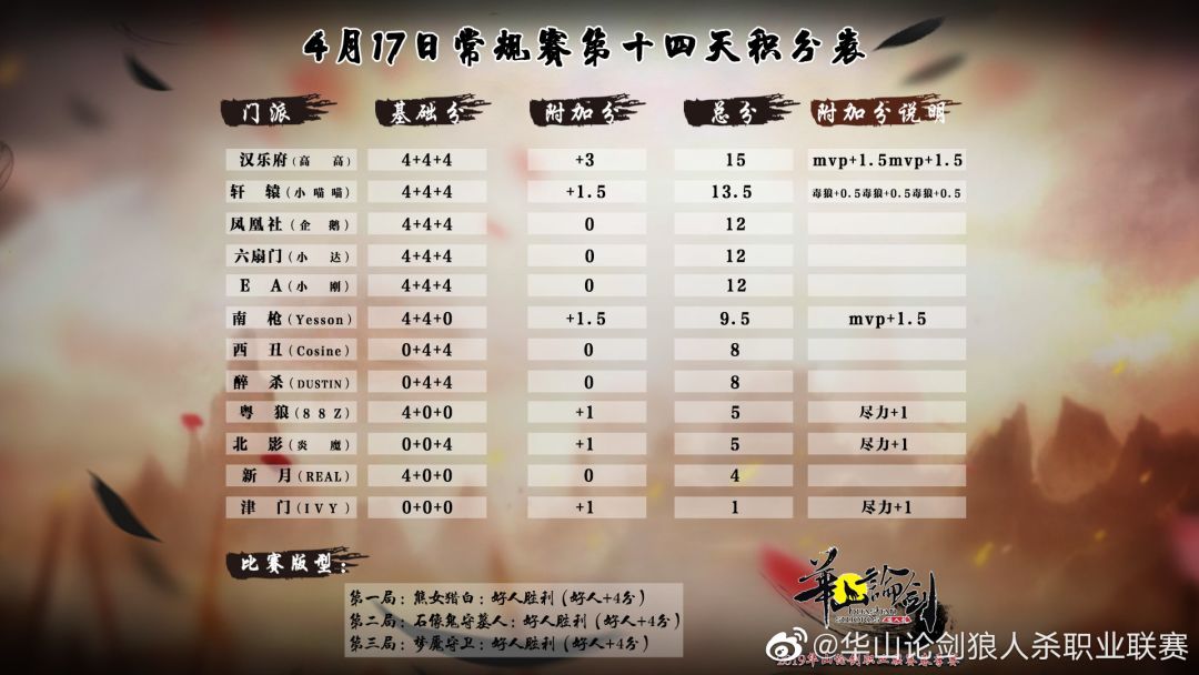 【2019华山论剑狼人杀职业联赛春季赛】「4月17日战报」 目前为止三连胜选手最多的一次常规赛😇 汉乐府高高以两局MVP拿到本场积分第一名,carry整场比赛! 轩辕派小喵喵获封“狼人杀手”连毒三狼😜南枪派yesson带好人走向胜利同获一局MVP 目前门派总积分新月以126.5分位居第一,凤凰社与六扇门紧咬比分跟随其后,比赛越来越激烈,各位门派继续加油!
