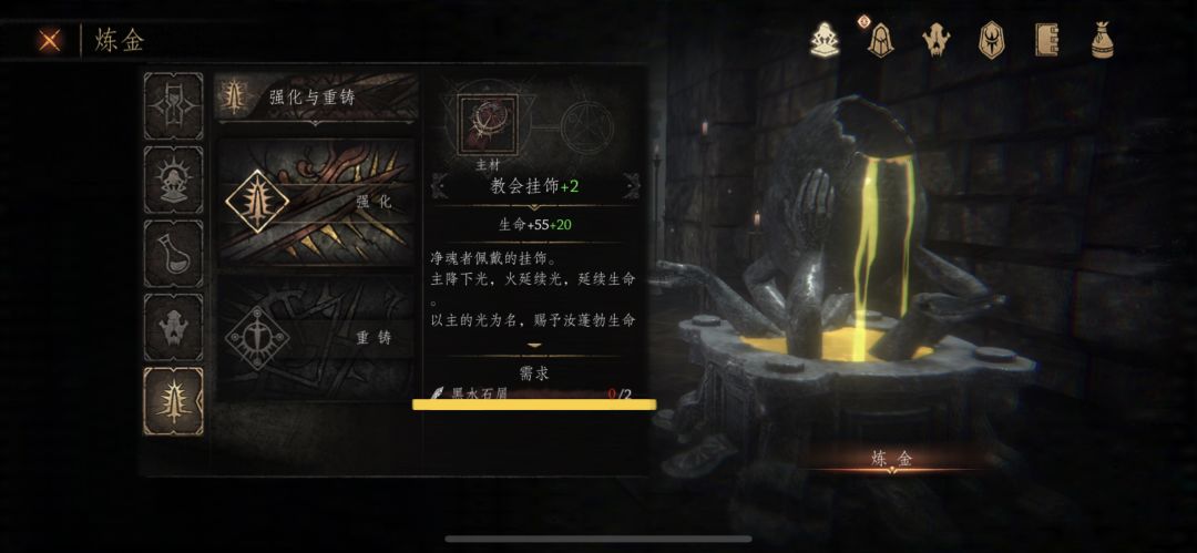 答:在祭坛中选择强化与重铸,强化可以使装备升级。那么如何判断自己的装备是几级呢?可以通过后缀的方式观察,目前最高是+5,在祭坛制作的装备是没有等级的(我这里指的是相对等级)。总共有三种材料用来给装备进行强化,分别是黑水石屑、黑水石块、黑水晶石。给装备从无到+1需要一个黑水石屑