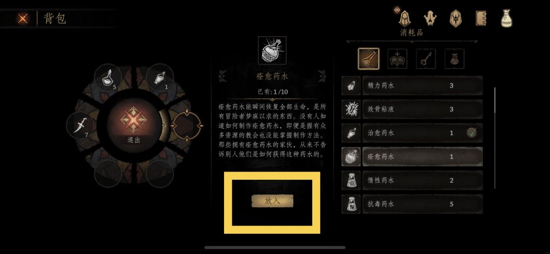 答:道具要自己手动添加到道具栏中,具体流程就是先点击背包—在消耗品中选择你想添加的道具—点击左边圆盘中间的快捷栏—在中间点击放入即可,如果想继续放入,重复该步骤即可。