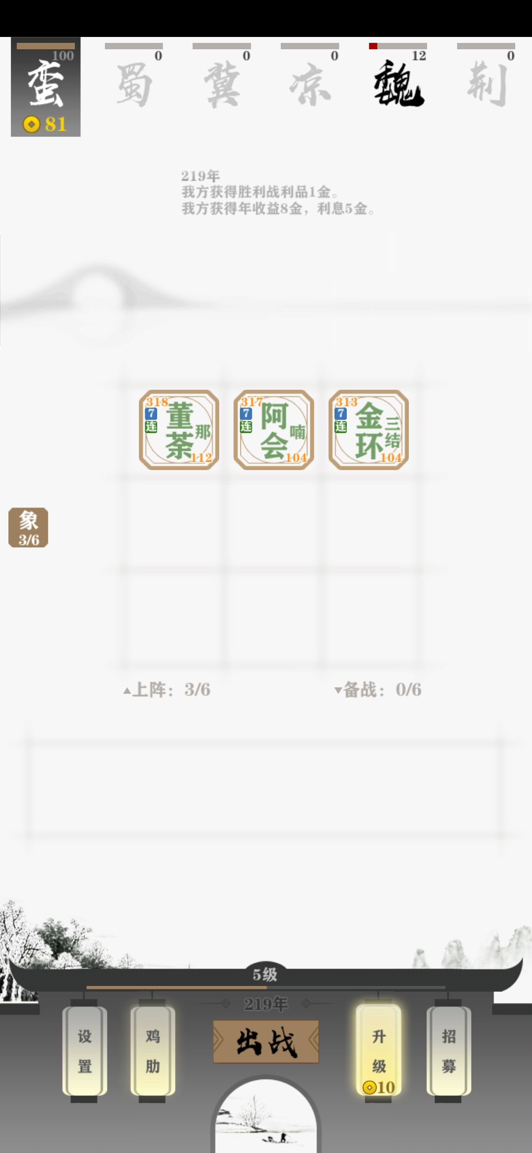 中期钱超过54在刷新 民心最好刷到10以下减其它颜色几率 士气101 偶尔的时候可能打不过剧情 象兵无脑刷了买就行了