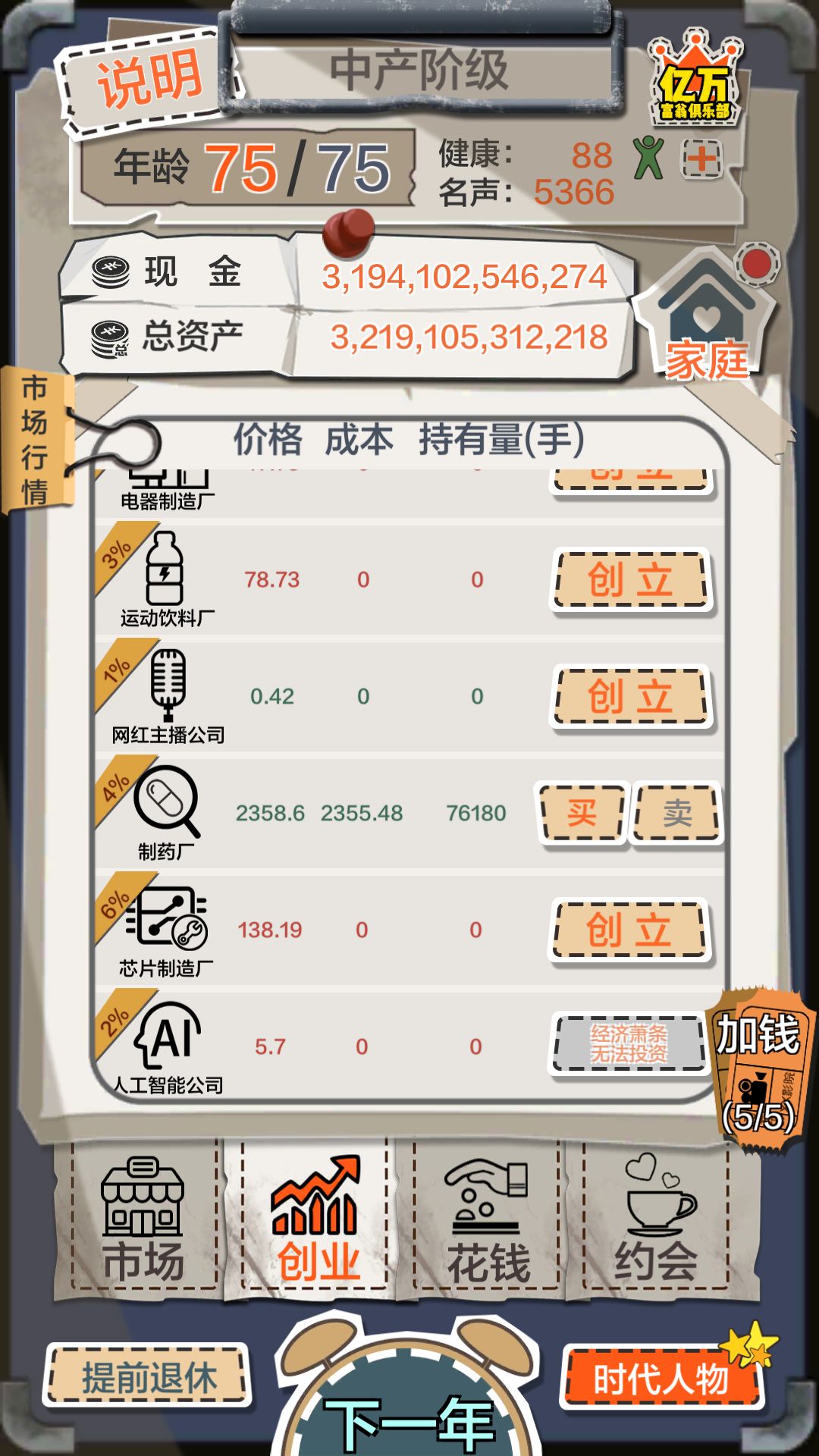 第一次写攻略,不足请指出。玩了两个星期,分享一下心得。首先家族运作和经营理念最好点满,解锁包包,开局可以约会三次左右,没遇到大哥就算了,别浪费钱。等包包低价买进,平价或高价卖出。钱够买制药厂就买,然后屯域名包包汽车(哪个低价买哪个)。等制药厂发展好后卖出大部分股票(别全买,不然等五年)再买进,家族资本运作有额外10%的利润,等到制药厂价值上亿后就不必屯货了,都没股票利润高,这时候可以考虑买房地产,然后任其发展。之后不断倒卖股票钱到15亿以上后买球队,先把最高一项升满,还有钱就升其他属性,升完后卖出(球队升满有25亿左右利润)给自己留一两个,其他倒卖一遍,轻松上百亿。然后根据情况去买彩票(别沉迷了,我有次直接回到解放前)。之后就可以买之前买的房地产,球队夺冠,股票升值,不断倒卖,上千亿没啥问题。最后我买彩票上了万亿。可惜老当益壮没点满,也没看广告,说不定能上4万亿