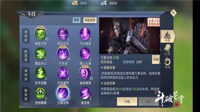 PK搭配:PK我们搭配的是悬壶济世、千伤诀、幽鬼毒煞、万毒法阵。我们仔细来看看这套功法,悬壶济世我们就不多说了,千伤诀(造成伤害的同时附加易伤效果,释放之后我们所有技能对敌方的伤害都能够最大化,PK非常的实用),幽鬼毒煞(超高伤害爆发技能,PK必备),万毒法阵(造成伤害的同时又可以降低敌方的攻击力,非常实用的技能)。这样搭配无论我们的续航能力还是输出爆发能力,都可说是非常的出色 ,而且PK输出能力不弱于雷族哦!好啦,这次药族的技能搭配攻略就到这里啦,大家对药族是不是突然产生兴趣了呀?不知斗者们有什么心得呢?可以评论区讨论一番。欢迎斗者们,下载《斗破苍穹手游》