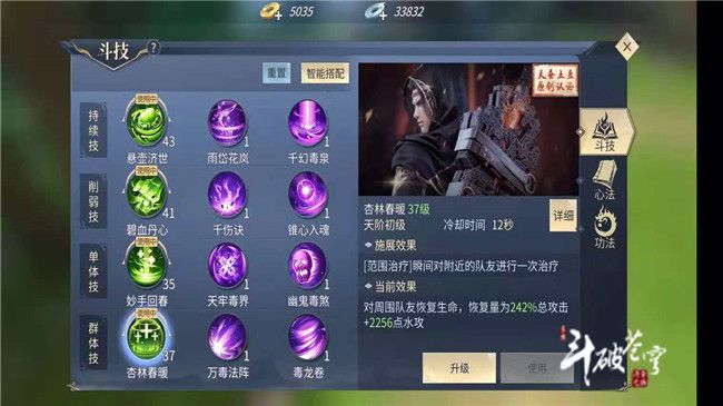 2. 斗气阁及秘境搭配:斗气阁和秘境难度有点高,我们搭配的是悬壶济世、碧血丹心、妙手回春以及杏林春暖,除了碧血丹心(附加减伤效果)以外,其它的都是加血技能。这套技能搭配以加血及辅助型技能为主,以此来减少我们对药物的消耗以及死亡次数。