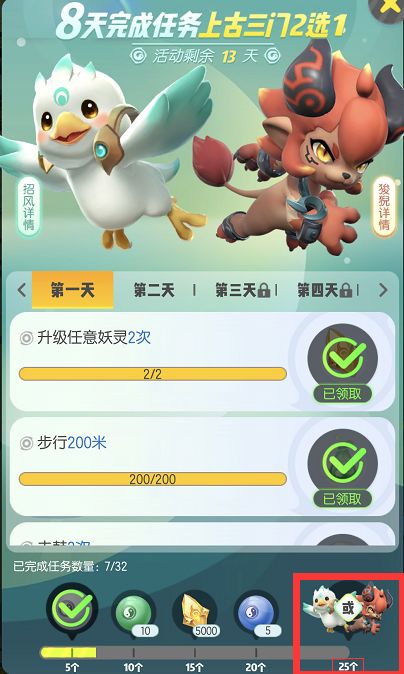 玩家可以在创建人物角色起,人物等级达到8级后,就会自动解锁活动中的八天御灵功能。活动会在解锁活动后开始计时,在十五天内只要完成25个任务就能获得想要的上古三门。除了妖灵外,玩家还能在每次任务完成时领取对应的任务奖励,这些奖励很实用,有云纹、钻石、大喇叭、灵力药剂、封印灵珠、高级封印灵珠,超级封印灵珠等。