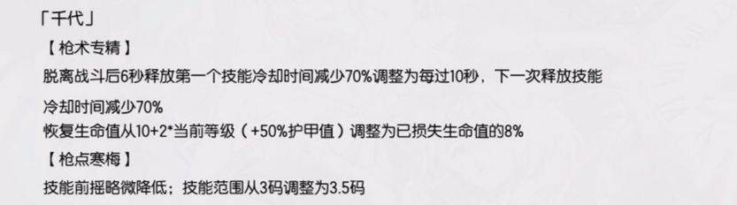 这次的体验服更新,千代的所有技能都得到了调整,那我就这几点来谈谈千代可能产生的变化以及优劣势。