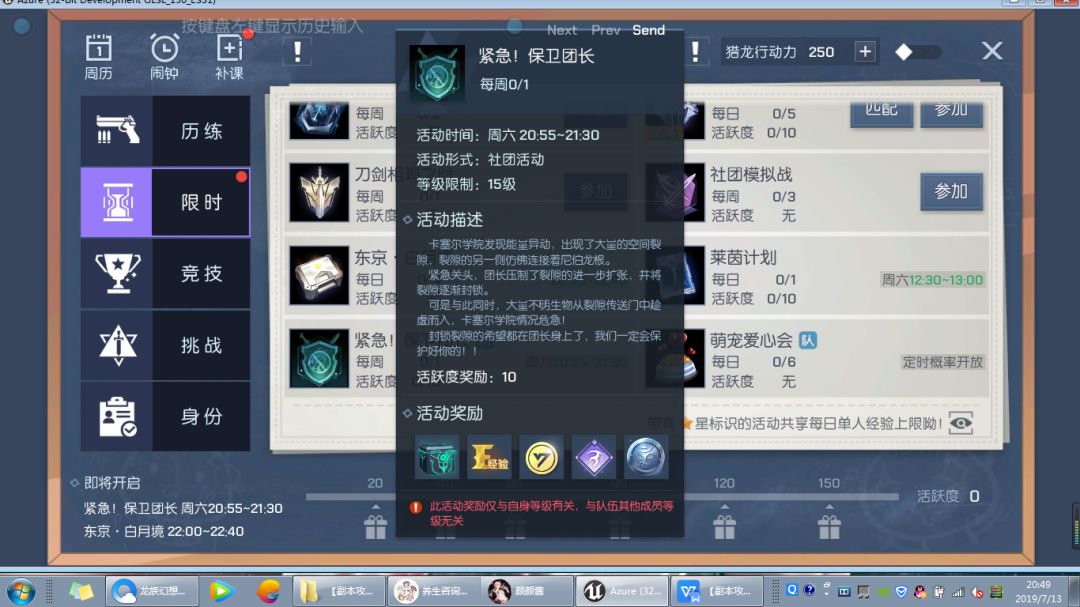 “紧急!保卫团长”是以周为单位进行的社团活动,活动开启时间是每周六的20:55-21:30,要求参加活动的社团成员等级达到15级,并且加入社团时间超过两天。活动结束之后,奖励将会以社团形式发放,社团成员需要进行拍卖获得这些奖励,而拍卖所得将会平分给所有参与活动的社团成员。同时社团成员还将会获得大量经验、社团贡献和社团之力奖励。
