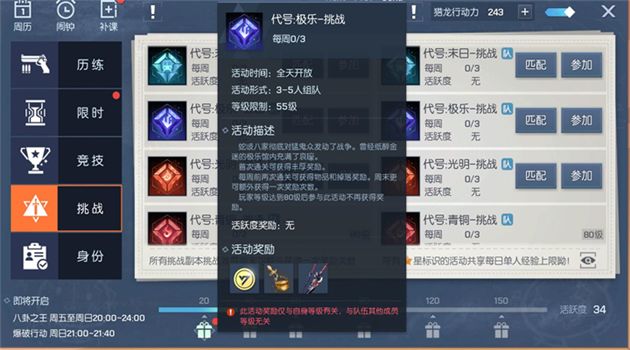 代号·极乐副本在玩家等级达到55级的时候开放挑战。活动全天开放,但是普通难度的代号极乐副本玩家每周只有两次挑战机会。而挑战难度的代号极乐副本一周则可以挑战三次,这三次分别是周一到周五2次,周末一次。代号·极乐副本还分为普通难度以及挑战两个等级。玩家通关不同难度的代号极乐副本所获得的奖励是不同的,虽然不论是通关普通还是挑战难度的代号极乐副本都能获得经验、金币、言灵催化剂及装备奖励,但是。挑战难度通关后获得的经验以及金币比普通难度的更高,言灵催化剂的等级也更高,掉落紫色装备的概率也是随着难度的提高而提升。需要注意的是玩家等级达到80级的时候再次挑战就不会再获得奖励,