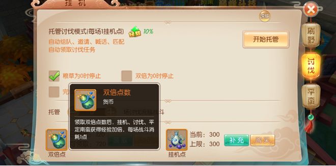 一路剧情走到32级,这个时候剧情又断拉~没关系,这个时候可以开始讨伐!在【日程】-【讨伐流寇】,这个时候小编就要告诉大家一个诀窍,讨伐会有双倍经验加成哦~选着【挂机】-【讨伐】增加双倍经验点!这里小编也建议大家开启讨伐的时候、直接双倍挂,先提升等级哦~