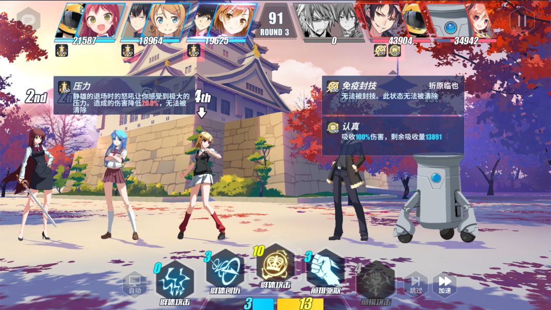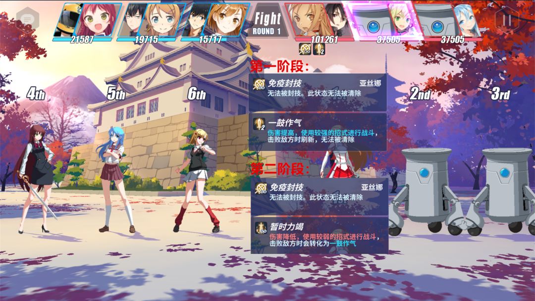②注意全队(尤其是前排)血量:由于亚丝娜会进行BUFF的切换,那么尽量让前排能撑过至少三个回合,以避免“一鼓作气”的效果一直存在。