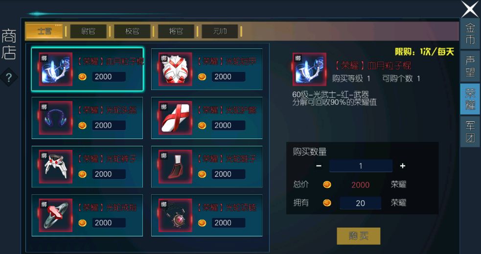 获得到手的荣耀值可以进入荣耀商店,换取更加强力的红装