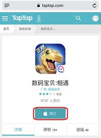 方法一:打开taptap的《数码宝贝:相遇》界面,点击数码宝贝相遇旁的网页链接(图一红圈圈出的“网页打开”),即可自动跳转到网页。点击预定(图二红圈圈出部分)会跳转入APP Store里的《数码宝贝:相遇》界面,点击获取,成功后截取显示“已预订”的游戏页面,并跟帖发布即可