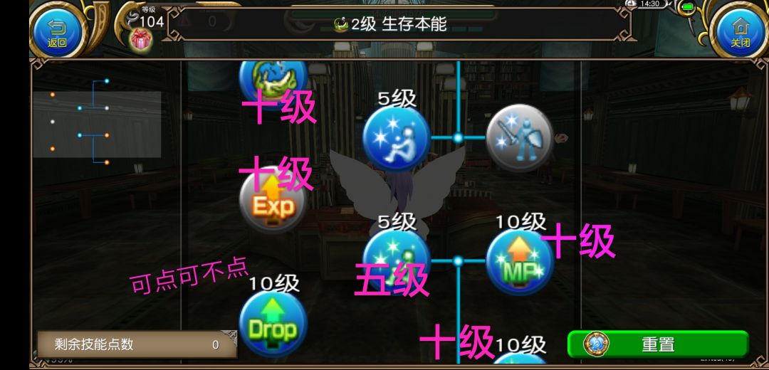 装死,经验值提高十级走起!装死让你死了之后更快爬起来,而经验值提高不言而喻,更快四阶啊!喘一口气,魔法值突破,沉着以对,当你能点的时候就点了,让你有更多的蓝和更高的回蓝。至于掉宝率和体力值突破,当你有技能点富余时,可以考虑,掉宝率十级,安心休息五级,体力值突破十级,游刃有余十级(全部都是提高生存的被动技能)