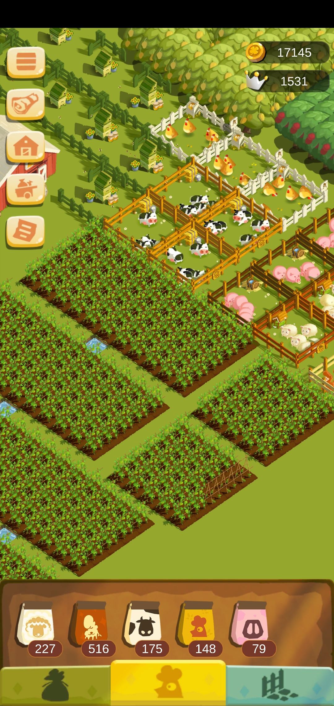 在田地和牲畜越来越多的时候我就想着什么时候能一键收割,看到更新后有这个功能后还挺开心。然而最近。。。田地越来越多。。😂跪求一键种植和一键喂养。。就喜欢一种种一片,一收收一堆。。