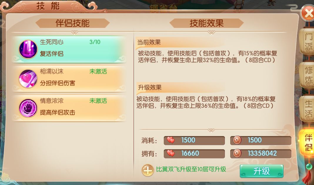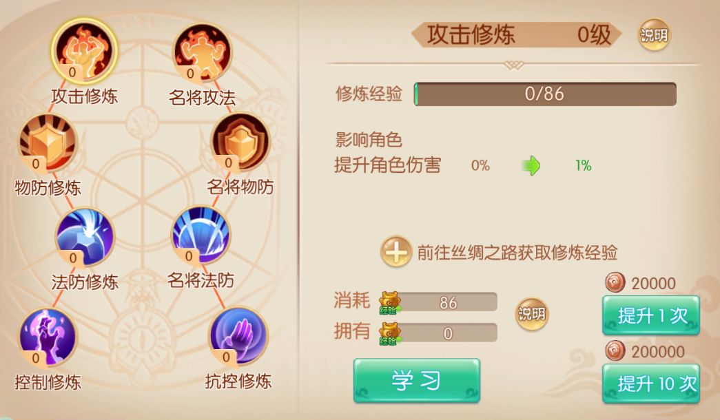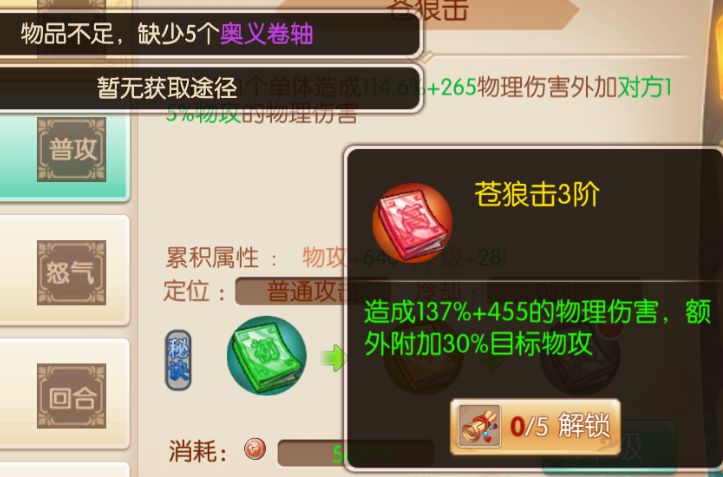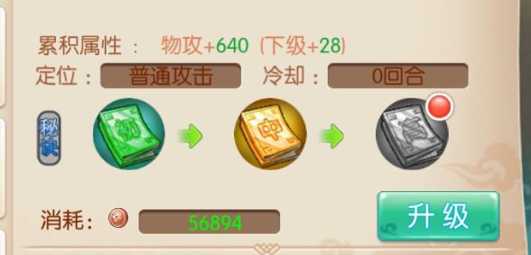 三、角色等级提升,然后效果部分铜币就可以提升技能等级,每个技能都有秘诀,提升秘诀等级可以给技能带来额外的效果,秘诀升级需要奥义卷轴