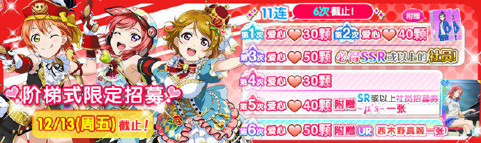 第六次:50颗爱心必得SR或以上的社员!附赠UR “西木野真姬”一张!