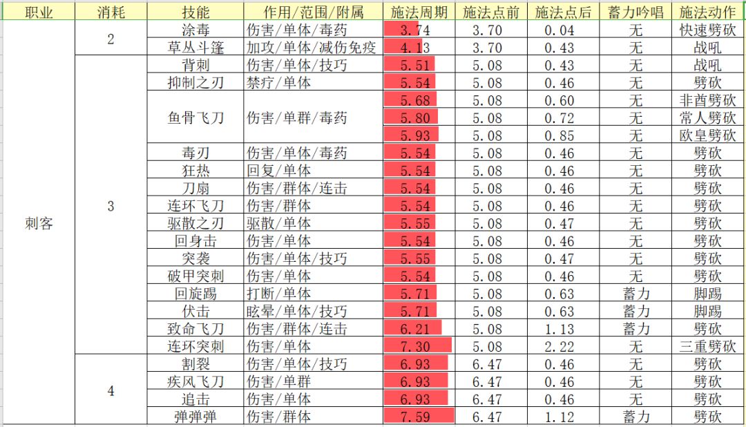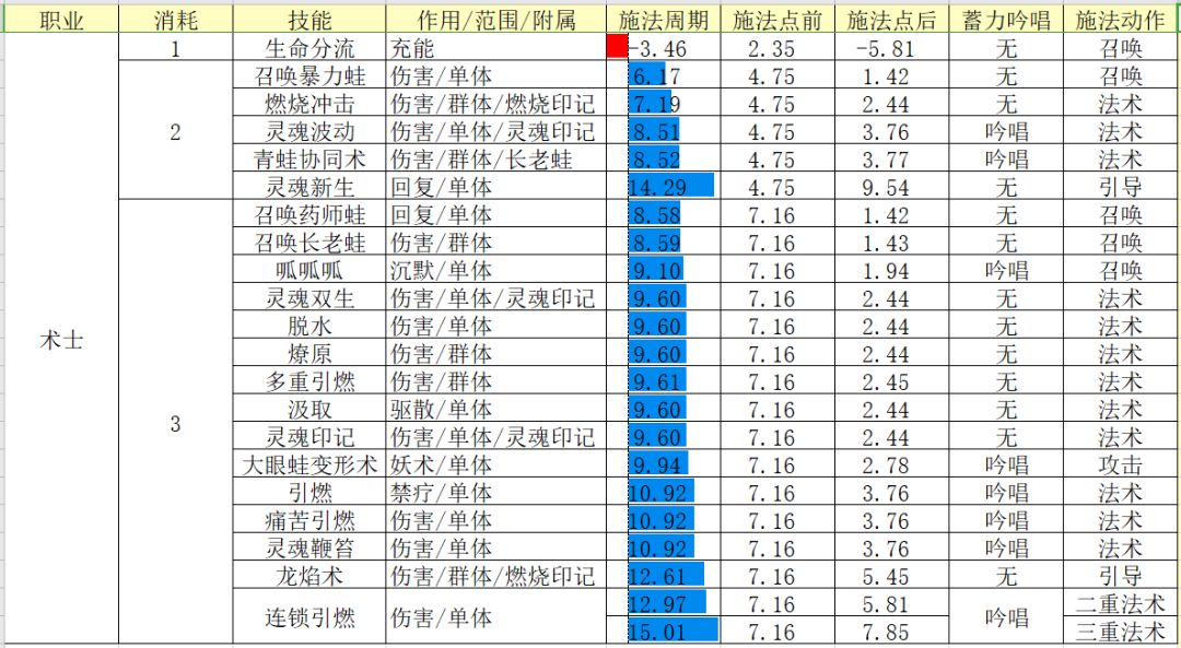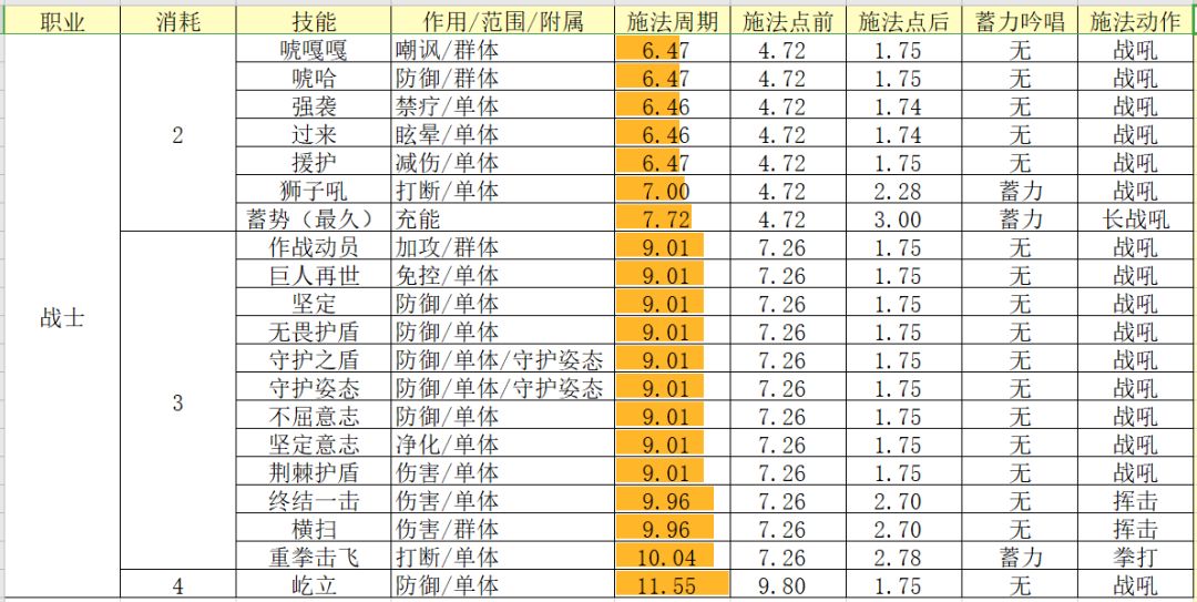 2.蓄力吟唱和施法动作影响施法点后时间h,蓄力吟唱是指释放技能是否需要读条,读条时间有长有短,施法动作则是放技能时的人物动作,不同的动作所需的时间也不同。比如术士的法术型吟唱需要约1.3s,但是召唤型吟唱就只需要约0.5s;横扫的施法动作是挥击,就比其他技能的战吼型施法动作慢了1s。