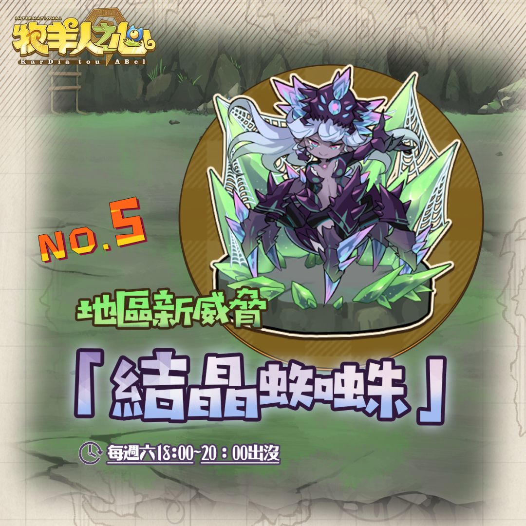 「結晶蜘蛛」上線;新地區威脅將替換「貓山王」在每週六18:00~20:00出沒;新素材——「混亂結晶」掉落。