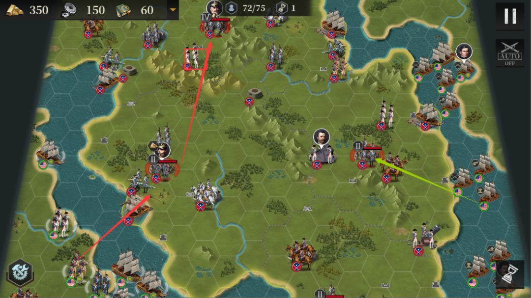 首先来讲第三关。本关需要渡海,对于新手来说可能会不习惯,部队需要一回合先走到岸边,下一回合才能下海。上岸也是一样,一回合靠岸下回合上岸。右边的敌军可以不用理会,盟友会帮我们解决,我们直接向上推进。红方块的敌军可以引出来打,合理利用有利地形。引出来后他们是不会回去的。这是我们遇到的第一个带星关卡,如果觉得难度较高,可以先往后打主线,打完再回来挑战,不会影响主线进度。