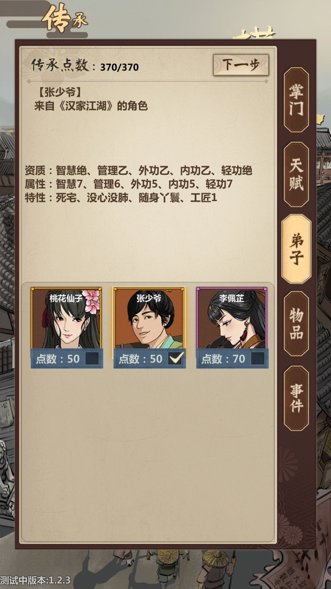 说明:打造装备交给弟子张少爷,或是不带少爷后面门派阶段刷工具人,门派前期主角行动点用于剧情跑商行侠等,同是门派开局有工匠3也不需要专门练技能,工程队建设也腾不开人手。