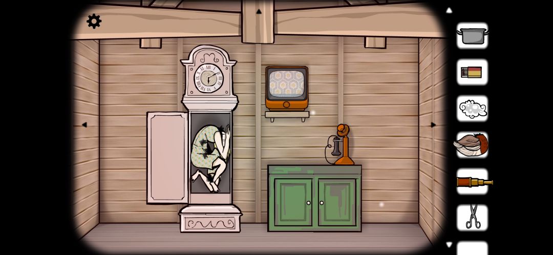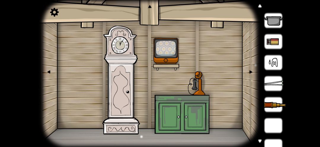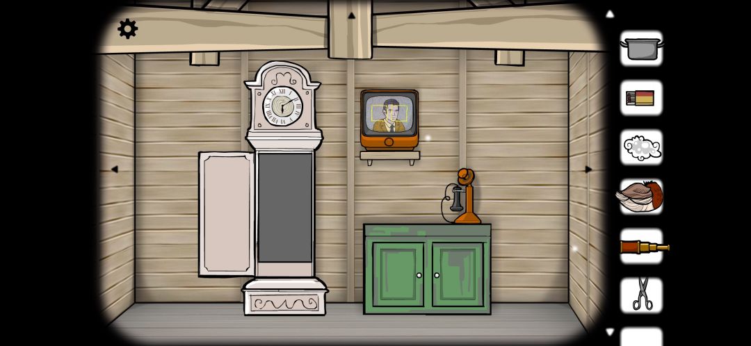 来到下一个场景,摆着一台立钟,一台电视还有一部电话。在柜子里可以找到针以及望远镜。