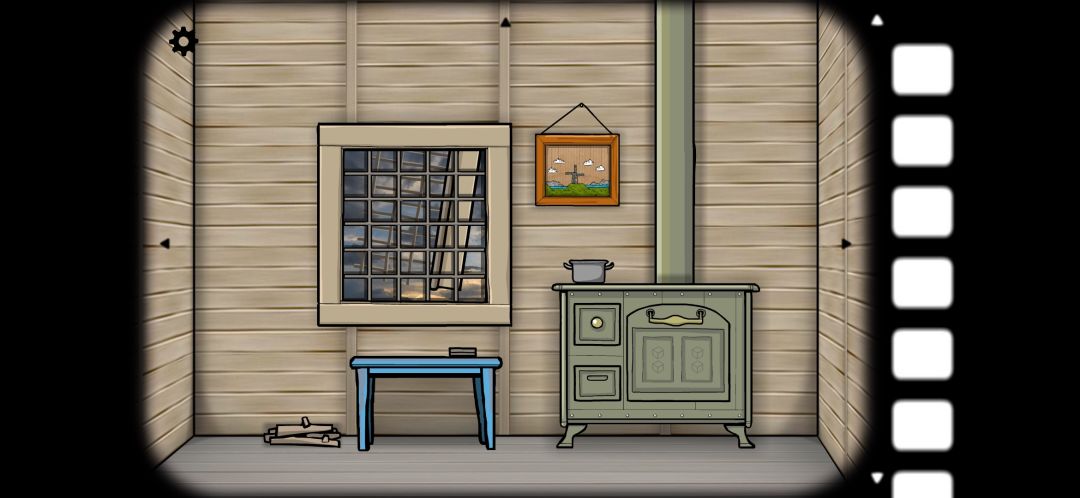来到灶台这一边,透过窗户可以看到风车的扇叶。桌子旁边有一堆木头,将其拿走。