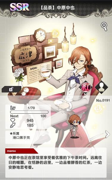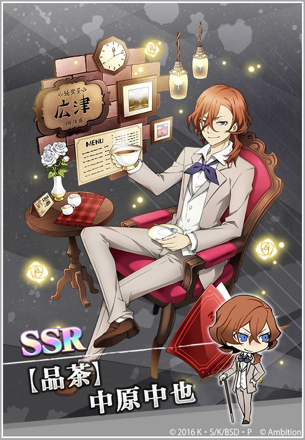 中原中也正在茶馆里享受着优雅的下午茶时间。远离往日的喧嚣,在恬静的店里,一边品着醇香的红茶,一边安静地思考着。