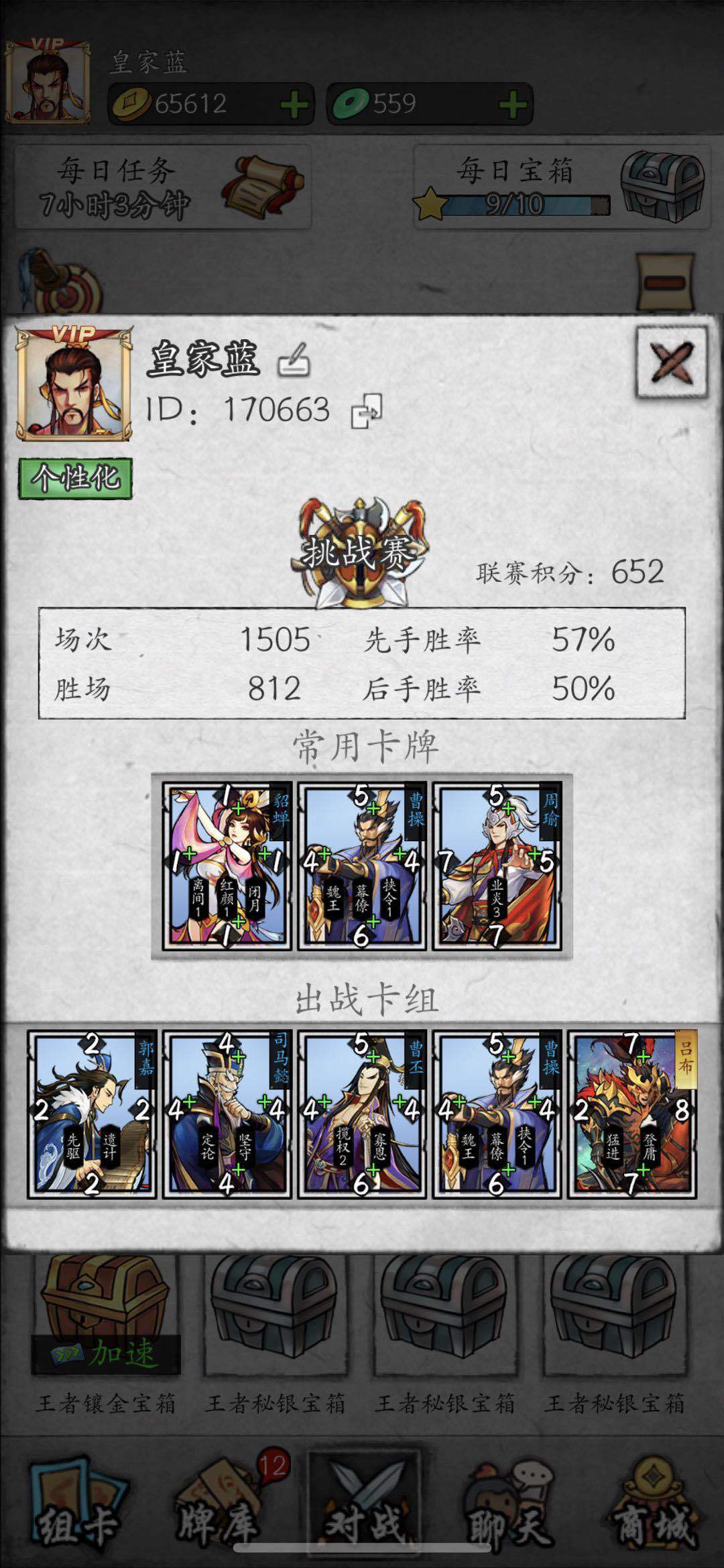 本人游戏名称 皇家蓝,ID是170663,刚玩这游戏第一把我就上瘾了,我记得应该是第二天高级二,第三天大师,第四天禅师四,然后再禅师二到四直接挣扎了4天,才一波连胜上的王者,我先是用的吴国上到禅师,然后小氪了一个吕布,换成了魏国(因为用吴国连着被sp吕布制裁了好几把),上了王者之后感觉总算可以放松一下练练阵容了,然后随便组了一套蜀国卡组,没想到一波连胜轻松到了300分,所以蜀国卡组可能不是我上分最稳定的卡组,但是感觉是可操作空间最大的卡组,同样的卡组操作起来上下限极高,所以打算第一期先介绍一下蜀国