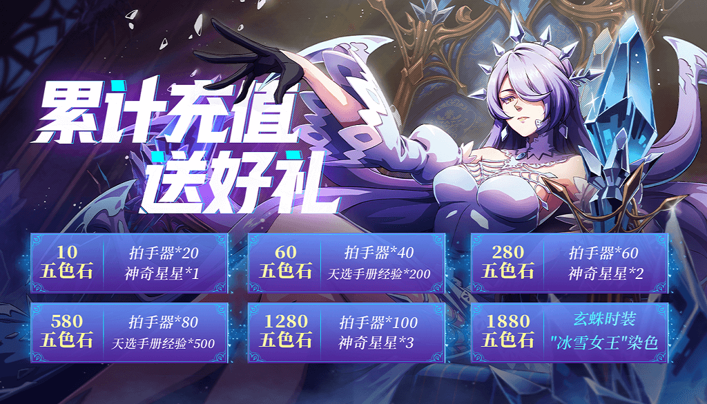 累计充值1280五色石 神奇星星*3和拍手器*100