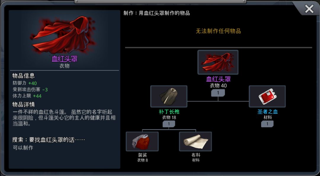 血红头罩(俗称小红帽)是余晖的加强版,+44体力上限,满级后血量202变成了正常血量,6层BUFF叠满每被打一下也会回24血,不仅防止被对手二连击,暴击,技能导致突然暴毙,更是大大增加了续航能力,在自己小药充足消耗不完格子非常吃紧,并且武器也没什么问题的情况下,比较推荐做小红帽。