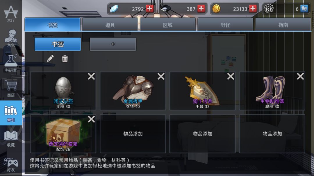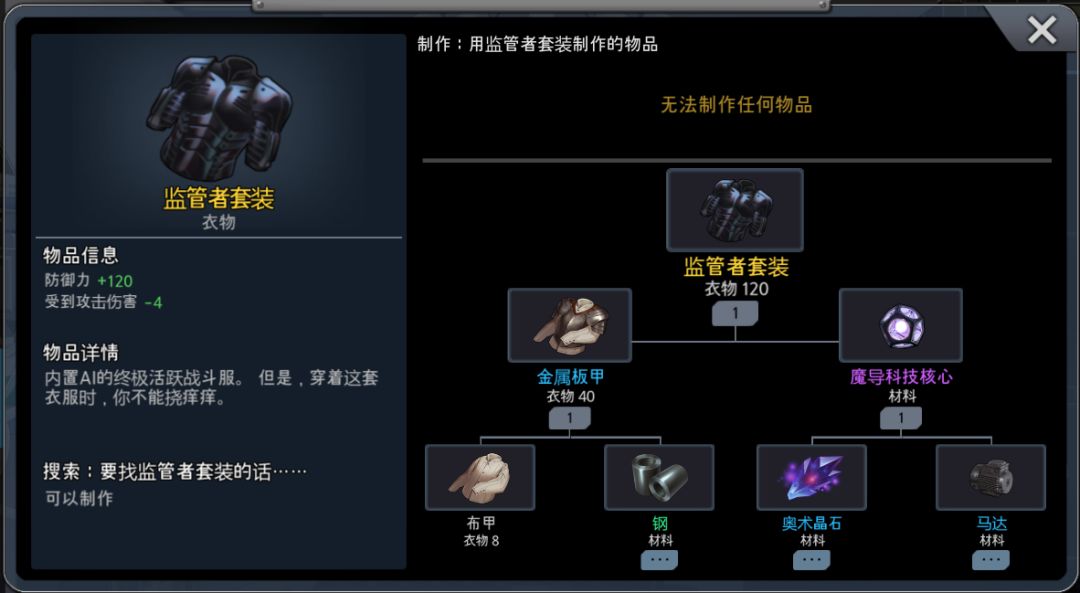 至此,防具已经做出自闭头 钢甲 钢手 生物鞋 猫箱,其他的蓝升紫在做药以及武器的过程中,就可以补全。
