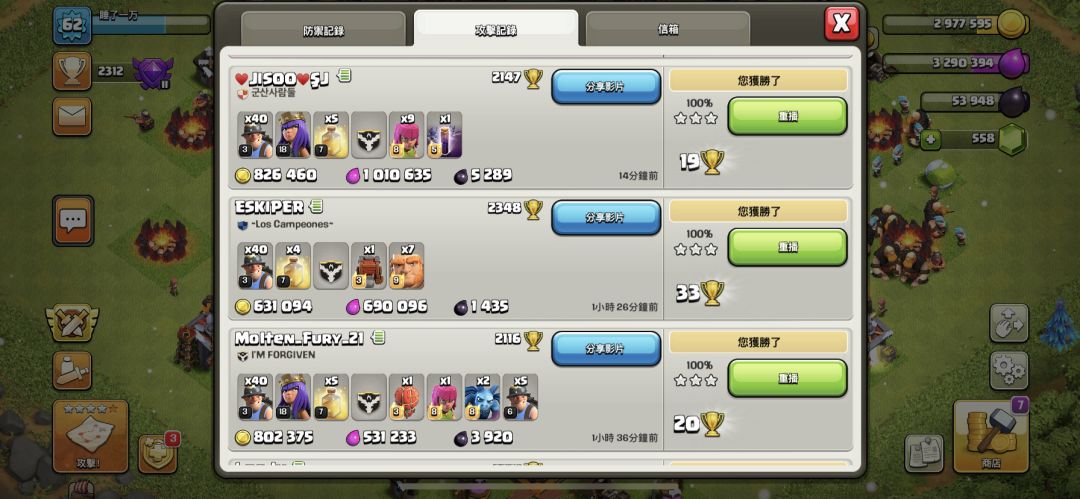 四、为什么说十本打资源简单,十本有矿工,懂得人自然懂,矿工是真的强,十本优先升矿工,等你有矿工之后,剩下的都很简单了,直接用40个矿工上水晶杯,矿工一字划开+援兵+药水基本都是可以平掉满9+初十,而且水+金最少也是80W以上,不算黑 ,水晶杯的黑也是搜一搜就会出3000+比你在 7 8 9打资源打的钱多太多了(我现在就是上线两波矿工基本是可以打到水+金140W左右,除去矿工+药水钱60w,,看你用的治疗多不多了,矿工一波20W水)所以十本在水晶杯打鱼最爽的,不是口嗨(有截图)