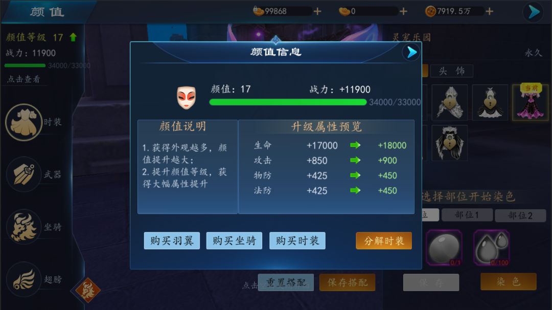 通过解锁更多的时装、时装武器、坐骑、羽翼,可获得颜值提升。颜值越高,增加的属性越多。