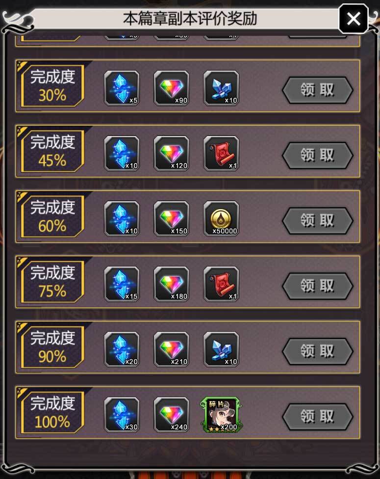 在探索过往的故事、完成记忆中的挑战后,达成相应事件卡牌的完成条件,可以获得包括钻石、水晶、能量、强化素材、装备材料、卡牌、时装等大量的奖励!