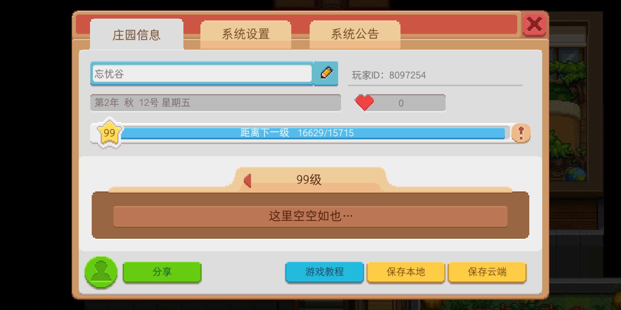 纪念2020-4-23 从开测到今天 划水到现在 终于还是99级了,时间过的好快呀~用时游戏时间第二年秋12日(用心度过游戏里的每一天)~我怕我玩的太快 小镇的人都老了hhh~和他们待在一起真的很开心呐~~