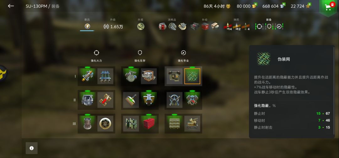 点完伪装网后,静止时隐蔽能达到67,移动隐蔽46,静止射击隐蔽能达到15,对比隔壁天蝎↓还是不错的