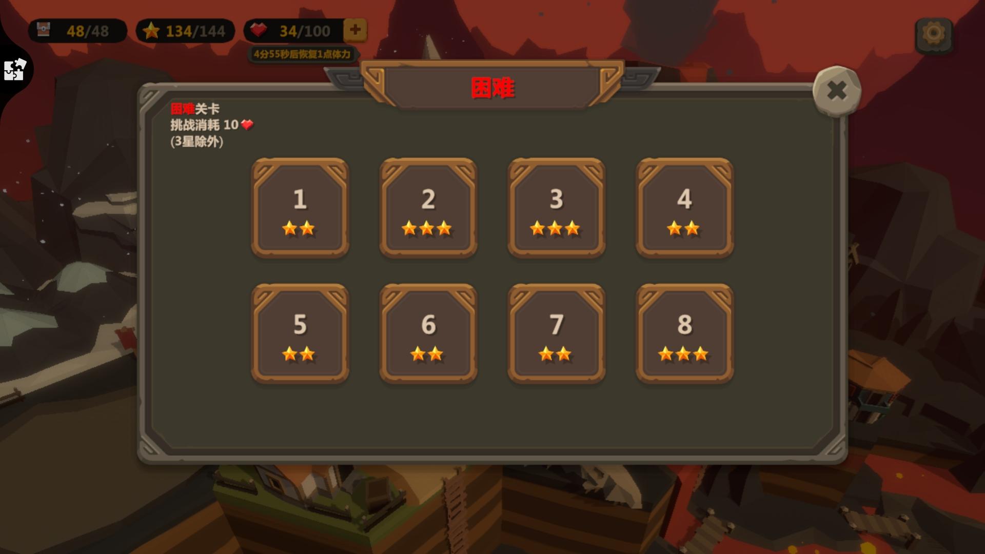 困难八关五个两星,前面一共五个两星过了,有些关还是挺有难度 也挺好玩的 不错的游戏