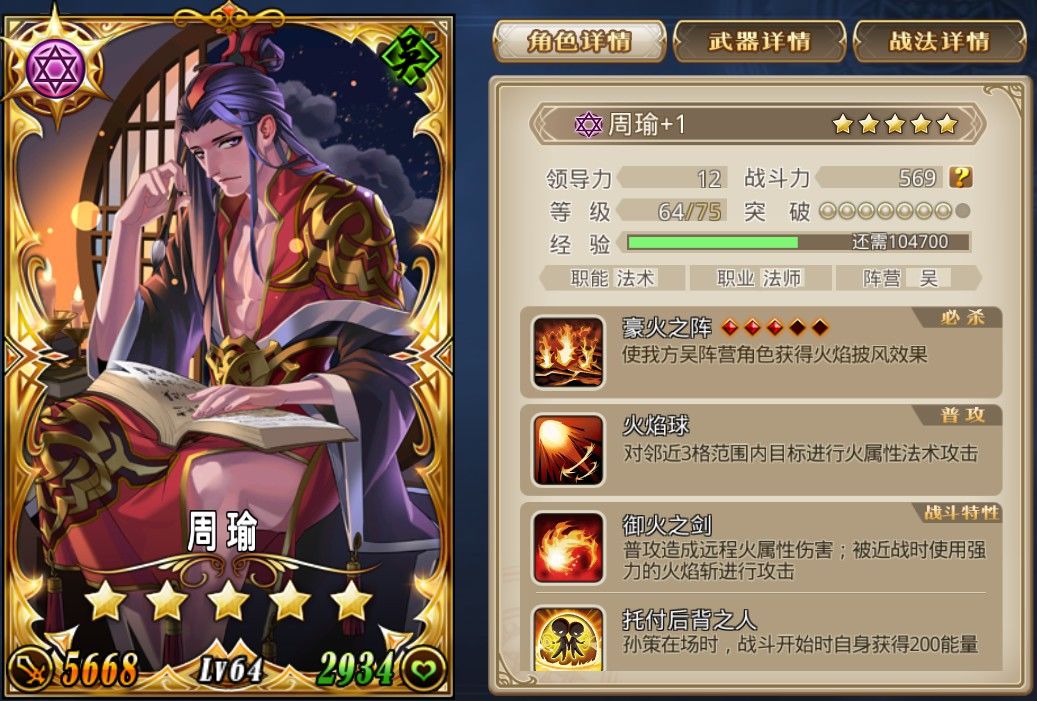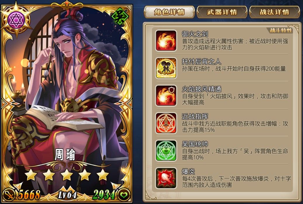 周瑜是偏重辅助能力的火属性法师,能为【吴】阵营友军提供许多增益,为近战阵容加持强力的攻击增幅光环。作为孙策的至交好友,可以为孙策提供许多帮助。周瑜自身的输出也不低,拥有范围伤害的特性,可以有效地补充伤害。