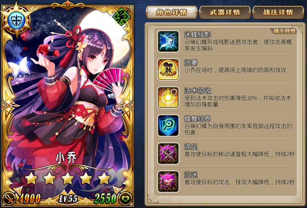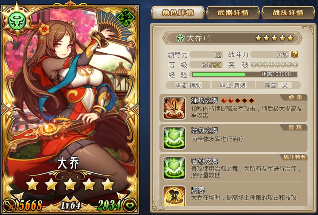 大乔是非常专业的光环型辅助角色,可以有效提高全队的输出能力,对近战和防御职能的武将有额外的攻防增益,作为贤妻对孙策更有额外的加成。需要注意的是,大乔本身的治疗能力比较平庸,必要时阵容中可以搭配其他的辅助职能武将。