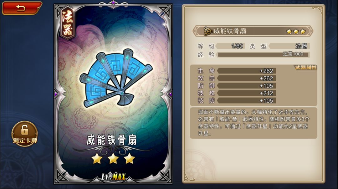 威能铁骨扇将会大幅特化必杀的攻击力,必带有【威能*叄】武器特性,释放技能时会大幅增加伤害。装备上能量满满的威能扇,小姐姐们的必杀技威力更加惊人哟~