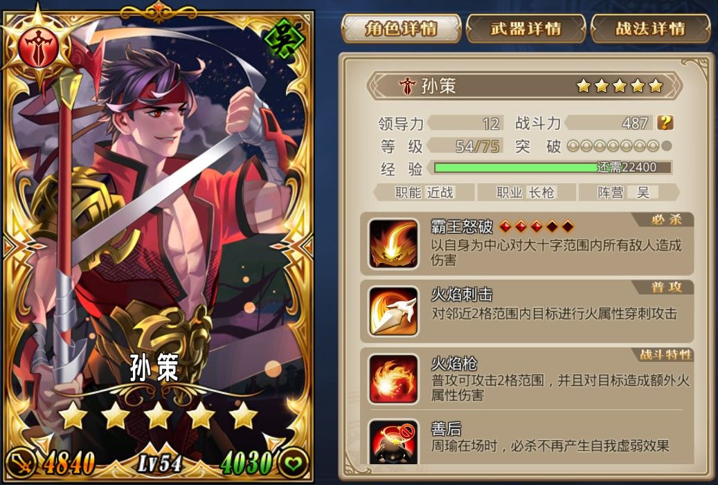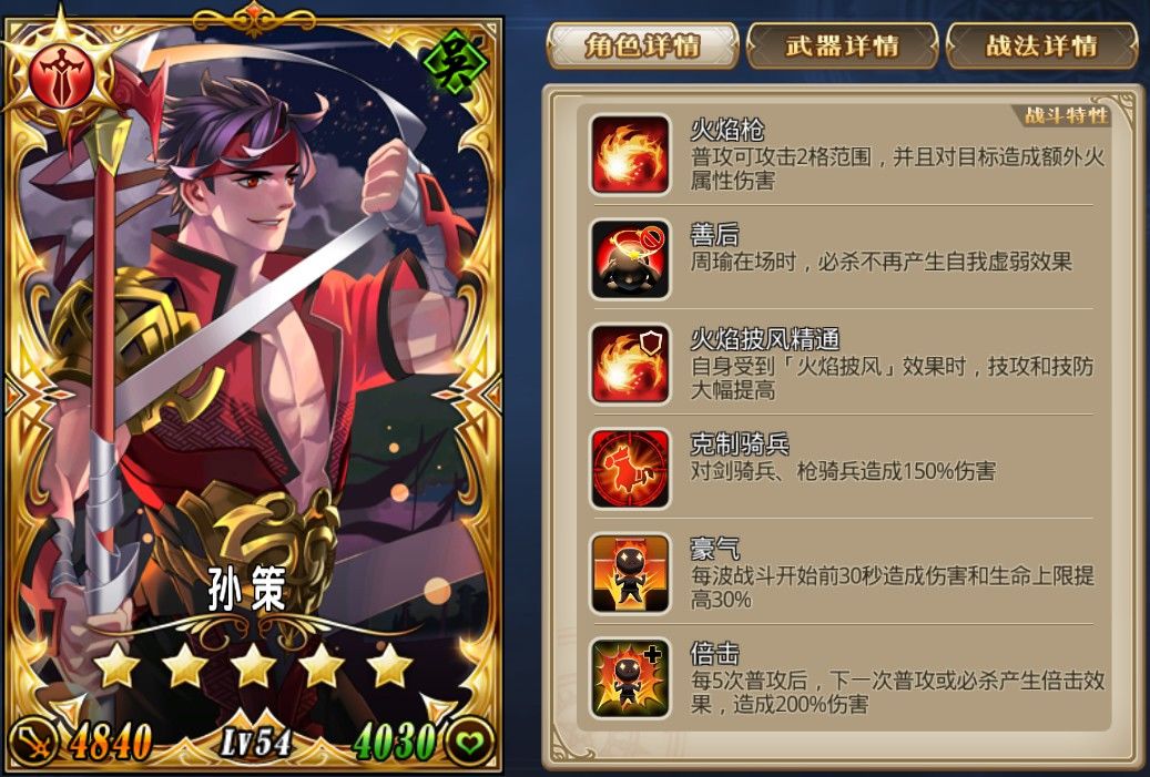 周瑜对于孙策来说是必不可少的好伙伴,没有周瑜的孙策,输出能力一般,且必杀后还会进入【虚弱】状态,无法自然回能。而获得周瑜帮助的孙策,伤害提升一个档次,且没有后顾之忧。在战斗中,孙策和周瑜搭配能打出不俗的伤害,也可以带上大小乔进一步增加策瑜的能力。手操控制【倍击】和周瑜必杀的释放,更能进一步增加输出能力。
