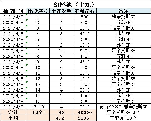 平均4.2发十连出货,平均成本2105石,平均出货率2.3%。