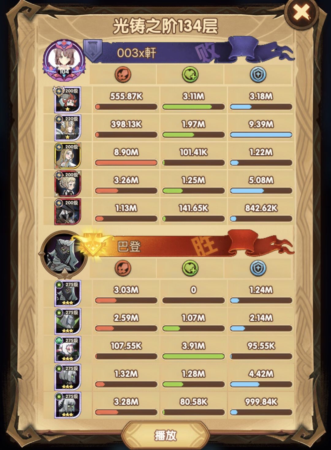 今日耀光种族塔进度至134层 有点出乎预料,之前一直是紫加光女打到了125层(大家不要误会哈,该借佣兵还是要借的,提前了解一下哪一关比较难,提前做好打算,就还是会很顺利的),今天光女升了个金加一下子又过了九层,还挺意外的🤣(这关这个巴登好恶心,伤害不够过不去)