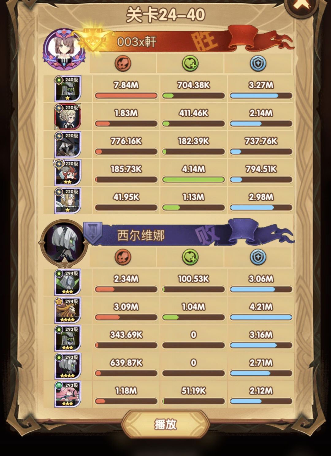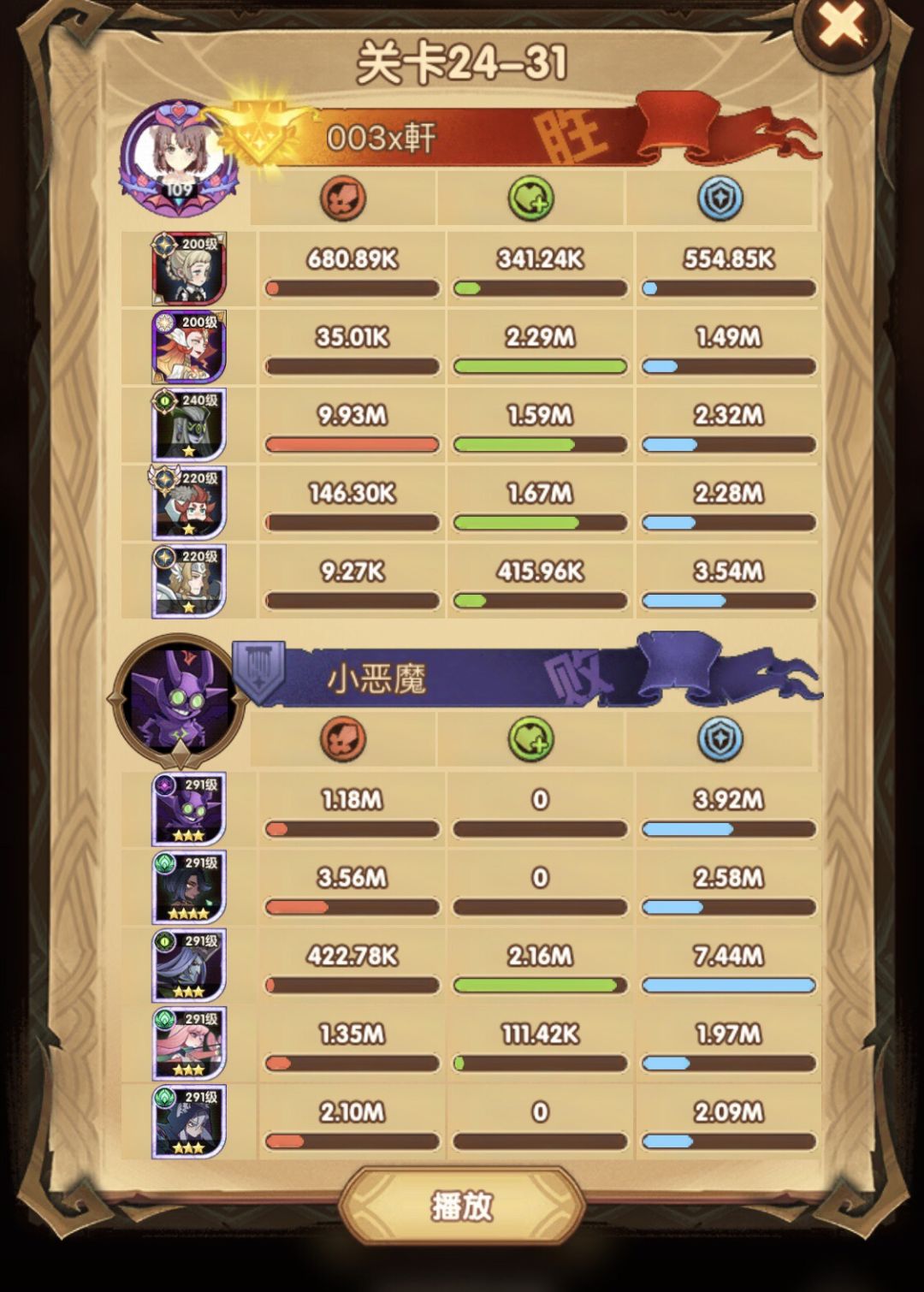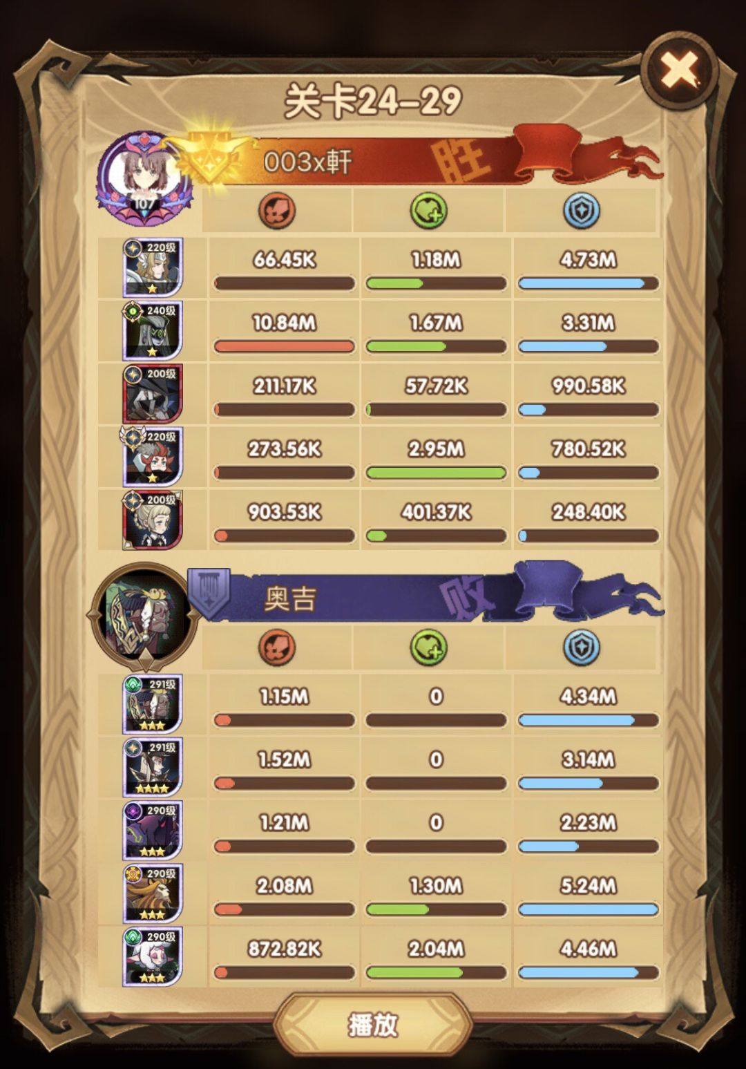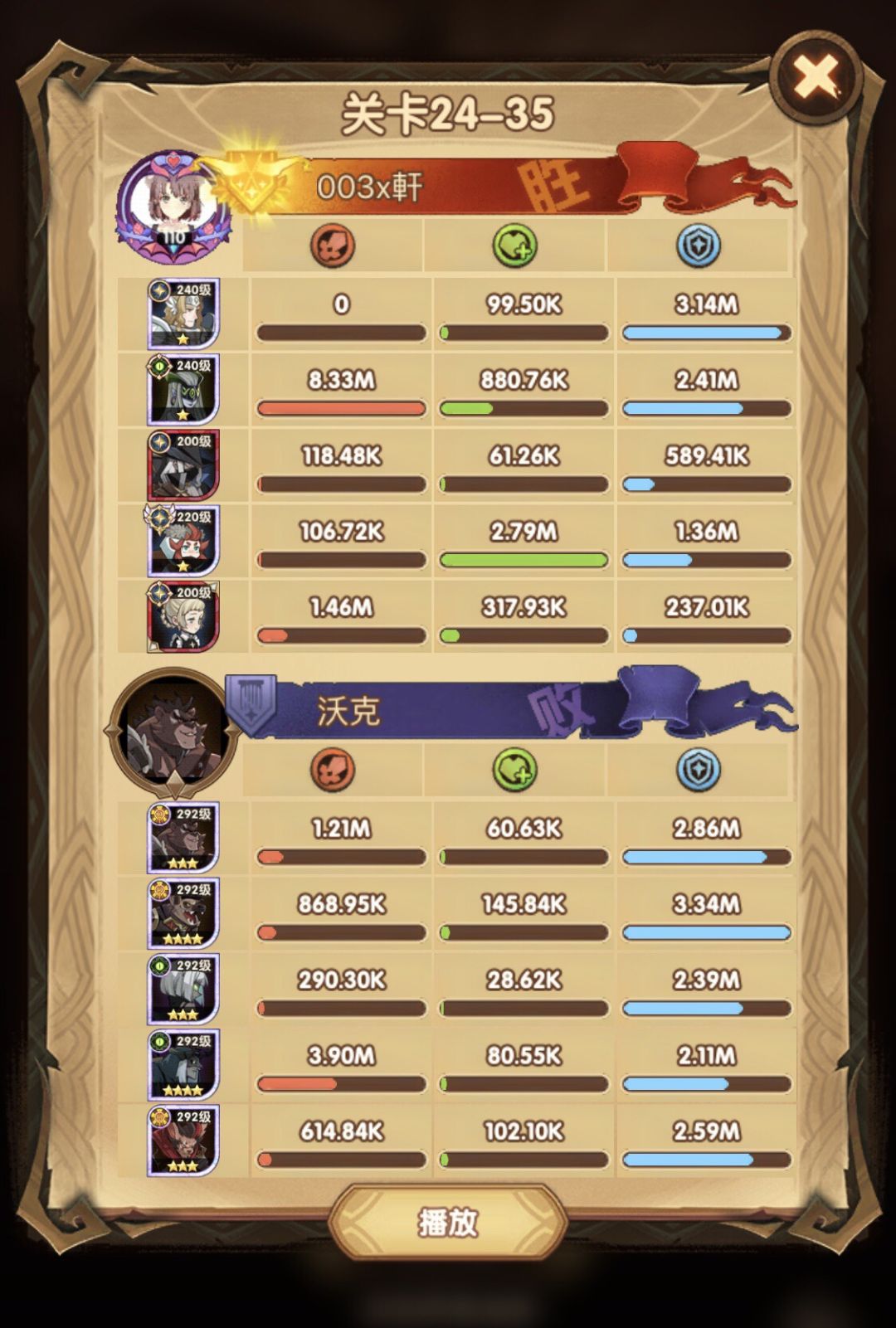 24-32 这关卡了两天,关卡记录大多是骨王,但我少个工具人兔男,本来想周末借了过,但今天粉够了4w,就先给光盾上240试了试,re200次左右过。