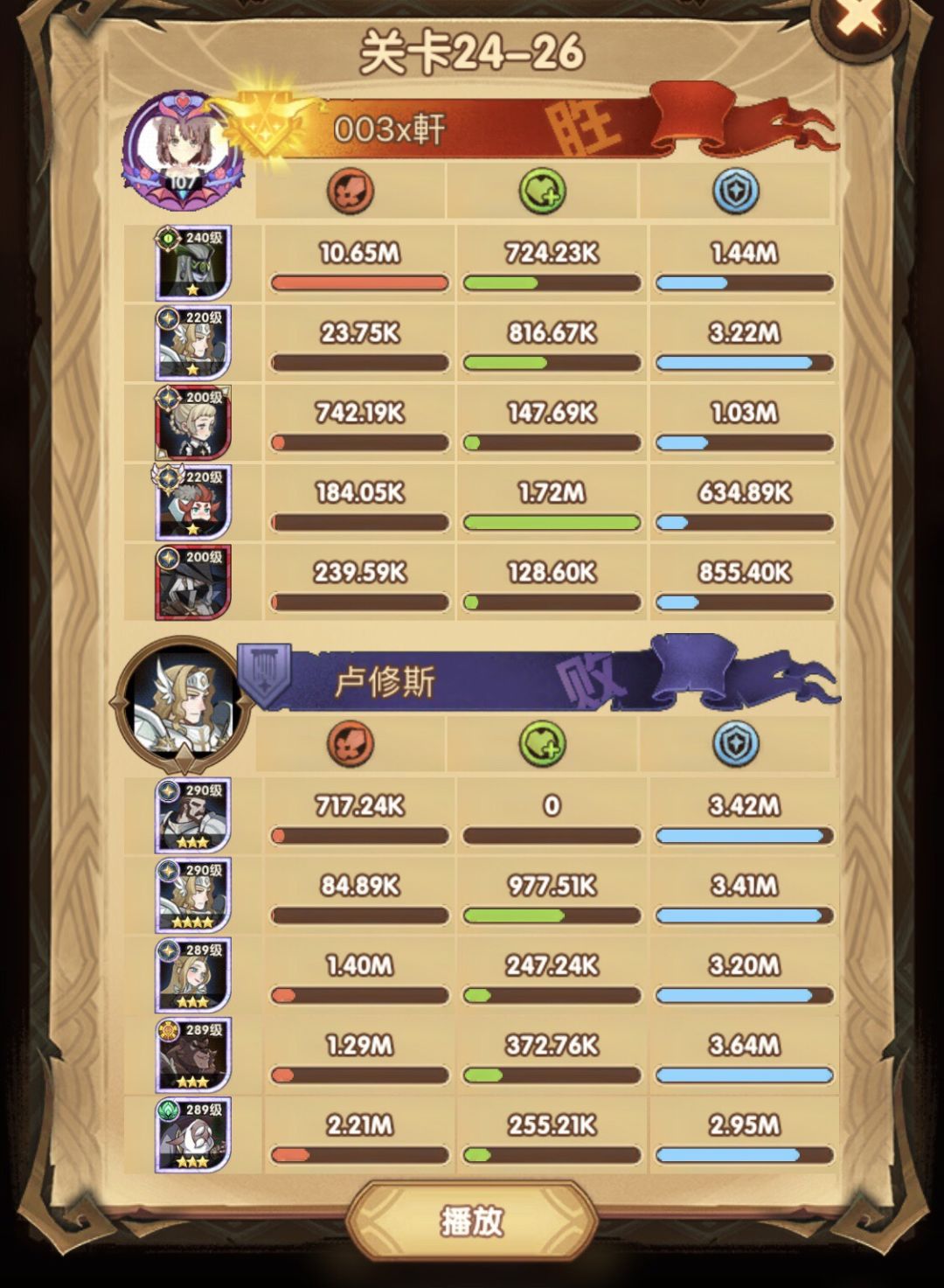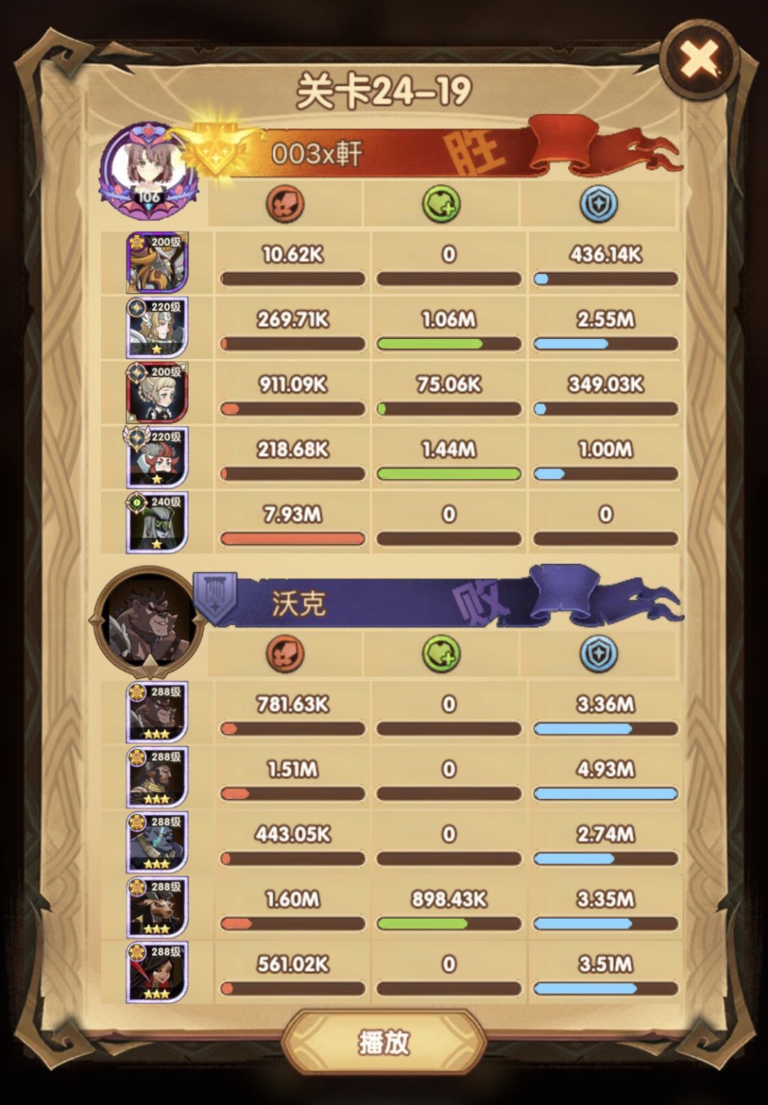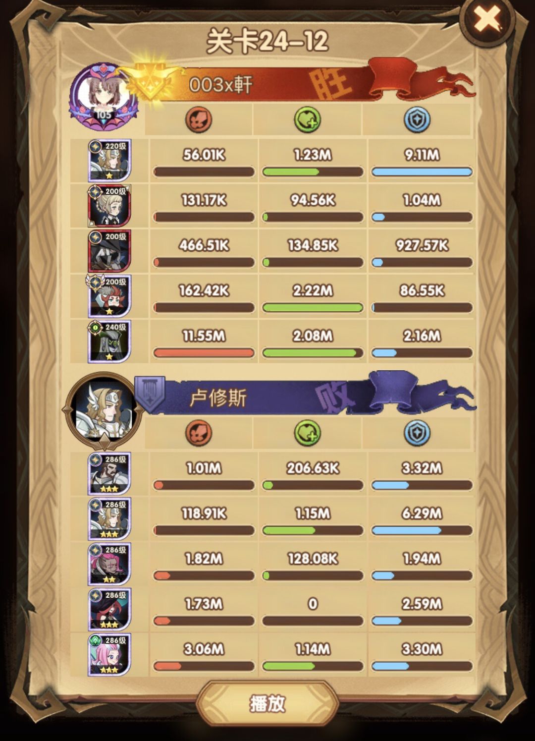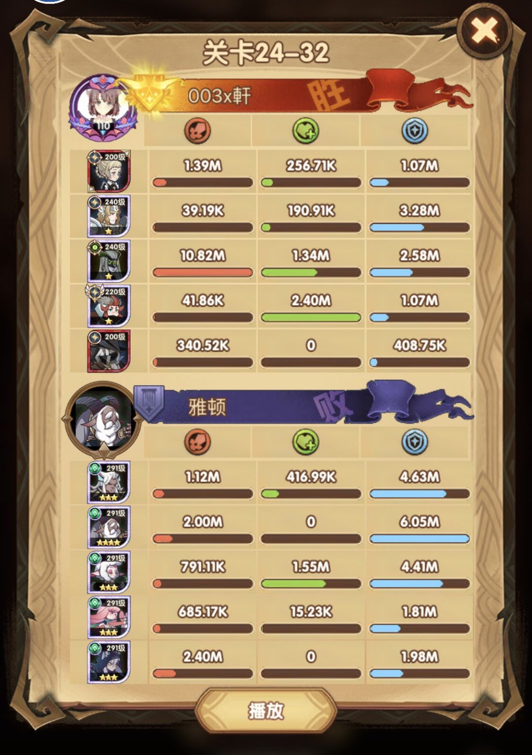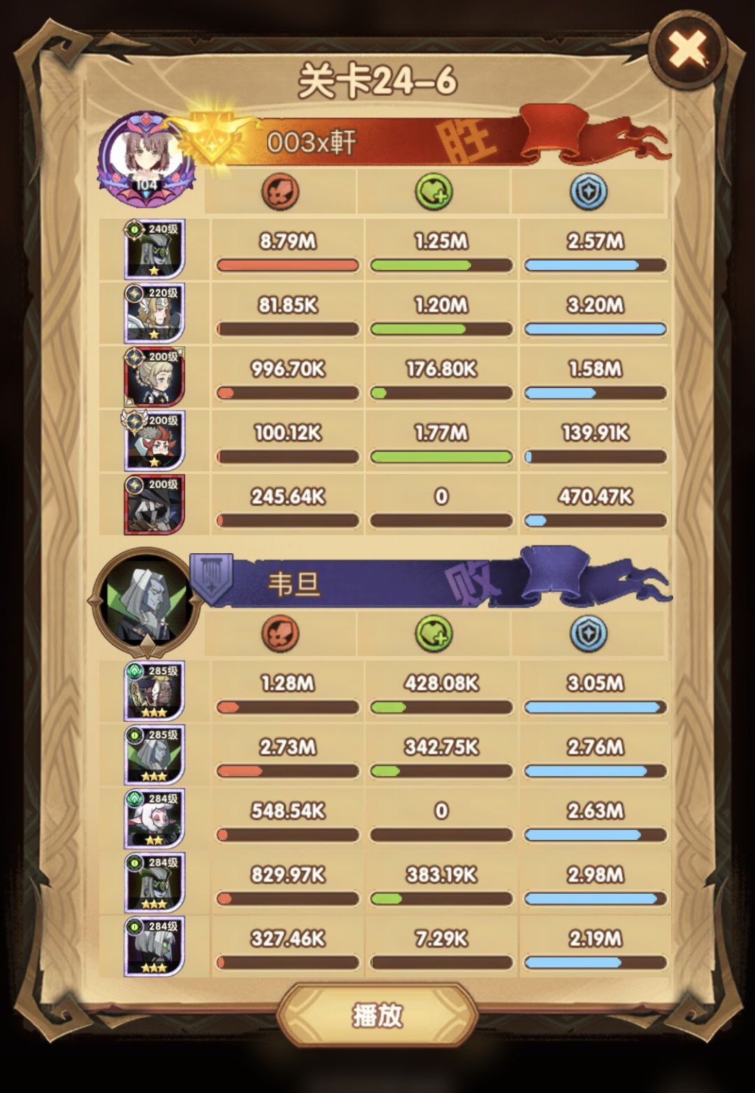 24-32 这关卡了两天,关卡记录大多是骨王,但我少个工具人兔男,本来想周末借了过,但今天粉够了4w,就先给光盾上240试了试,re200次左右过。