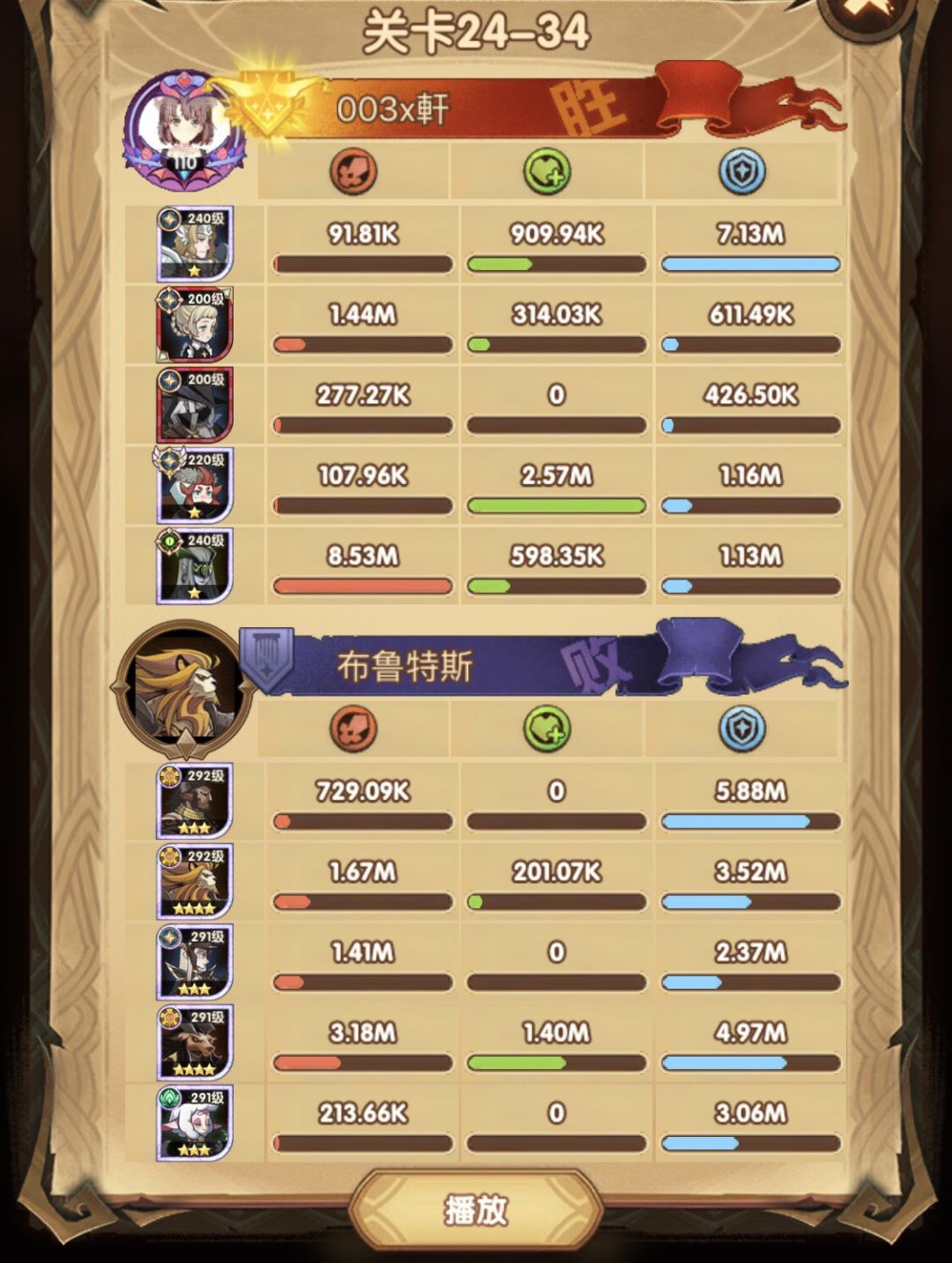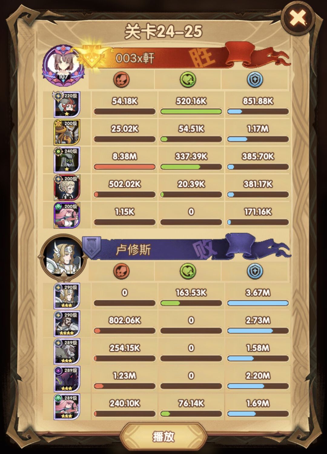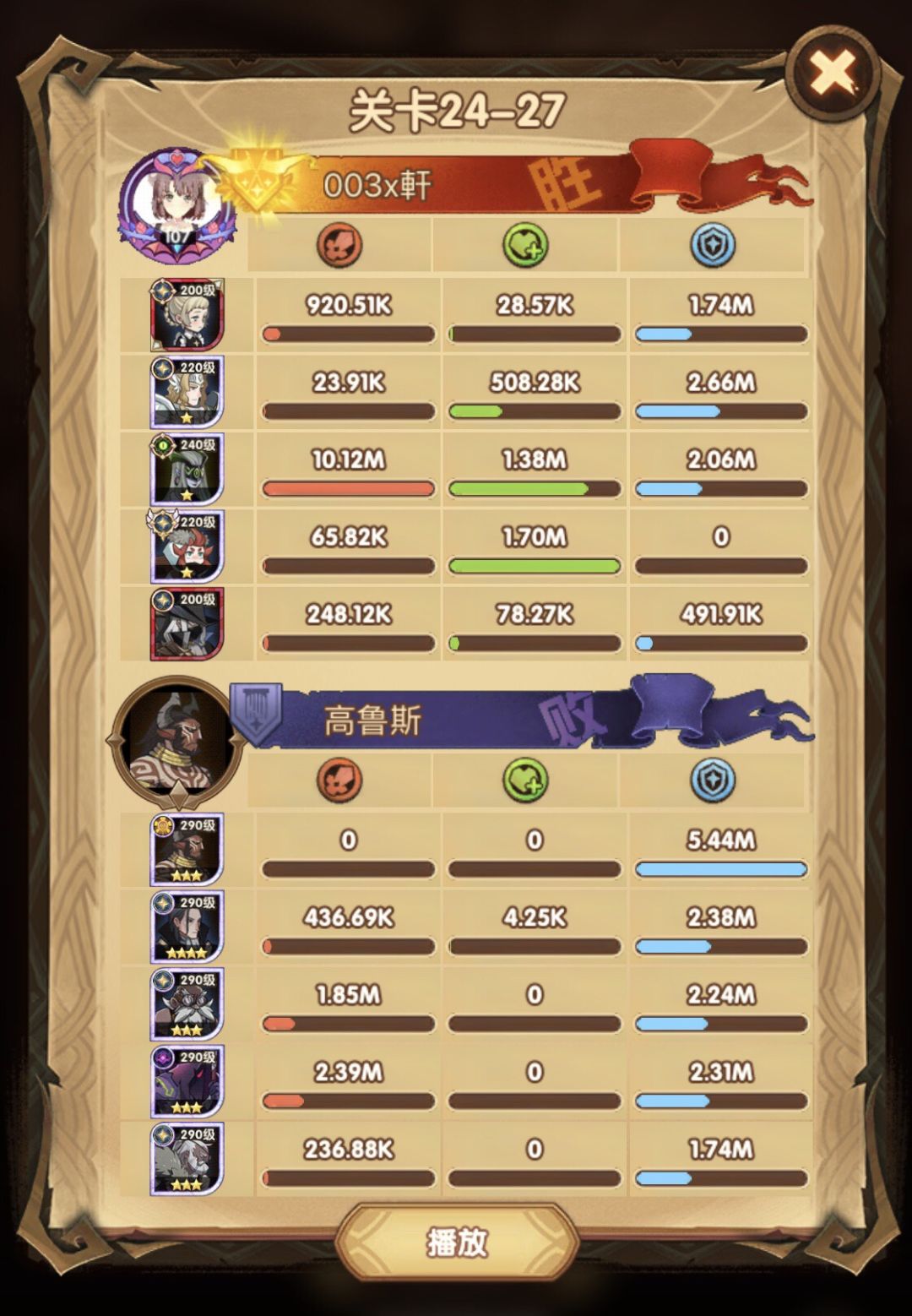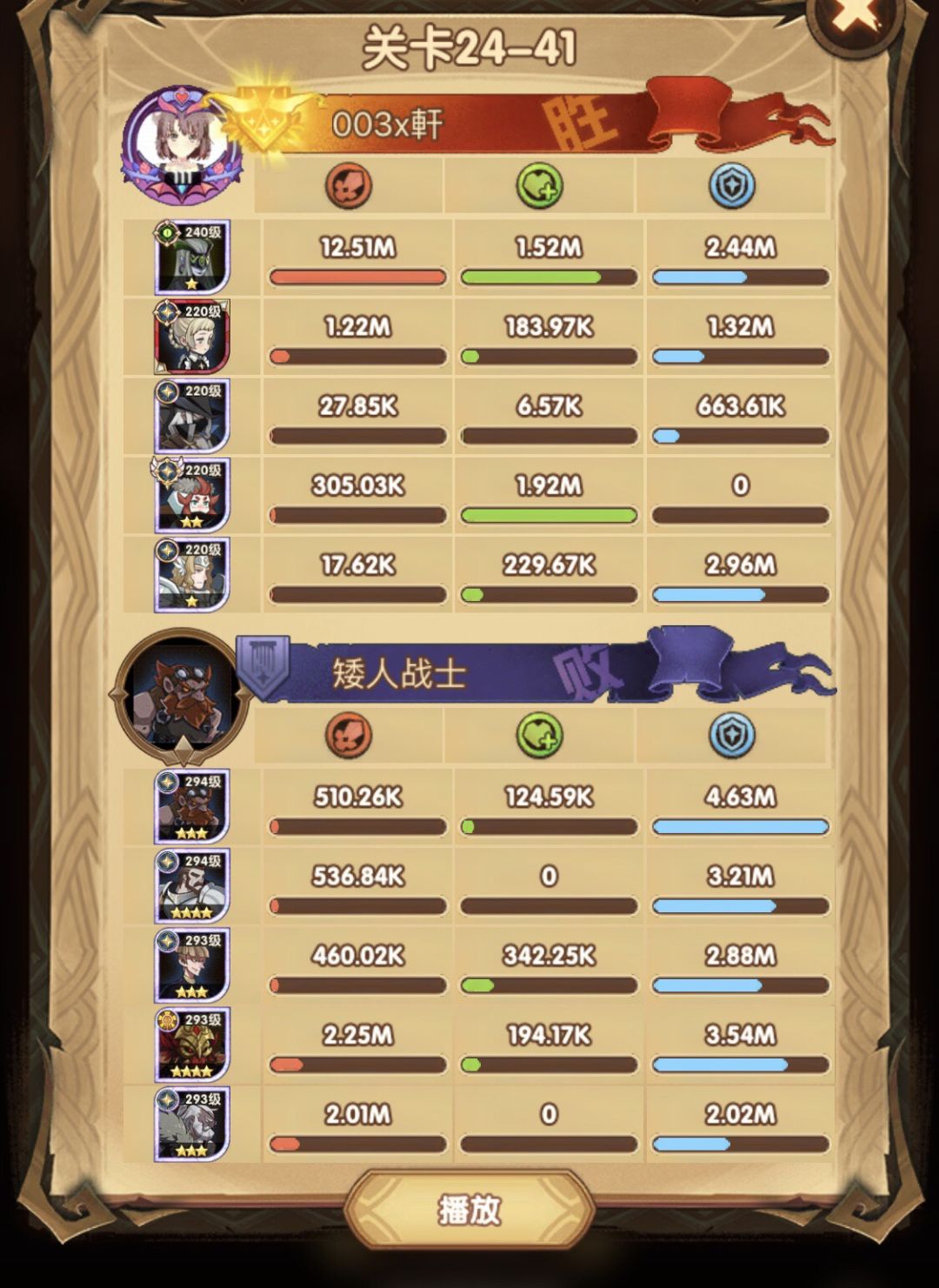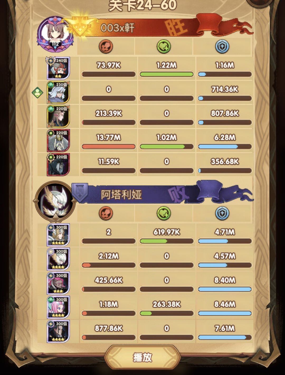 24-20 借了个狮子,还是re了一百多次才过😂 可能大家想问 这关为什么要借狮子,狮子不是工具人吗?七秒真男人存在什么品质差距?借狮子有啥用? 但实际上,这关的我能不能过的区别在于,啪啪熊能不能把狮子背到后面去!能把狮子背过去的话,上面那三个人都会跑过去打狮子,这才能给女妖女仆双大留下足够时间,因为他们要跑路啊,就差这么一点点的时间,足够商人放二大来晕住,或者让他们死在女妖二大的路上提前触发对面狮子的不屈。然后狮子的差距在哪里,说白了就是借的狮子血多一点,我的紫加狮子一碰就会不屈,而狮子在不屈期间是免疫控制的,也就是说没法被背到后面去,借的狮子能稍微抗两下再不屈,这是差别。(当然过程也没有这么顺利,比如棺材看心情关骨弓,比如女仆看心情开大……)